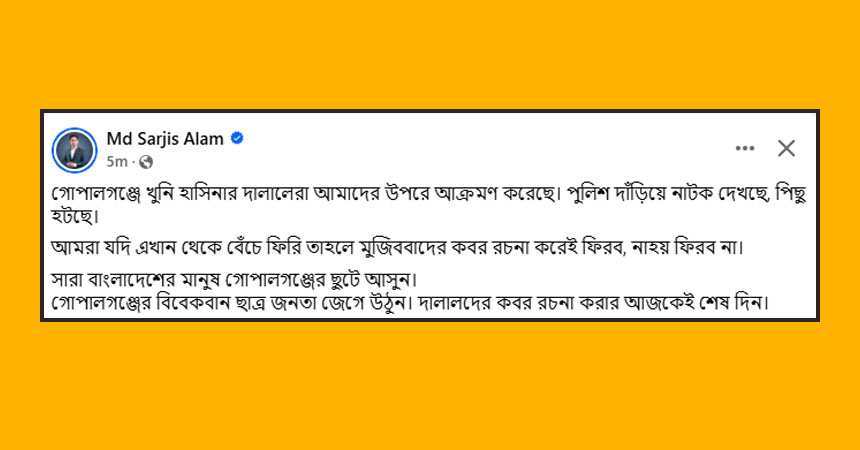 তিনি দেশের জনগণের প্রতি আহ্বান জানিয়ে লেখেন, ‘সারা বাংলাদেশের মানুষ গোপালগঞ্জে ছুটে আসুন। গোপালগঞ্জের বিবেকবান ছাত্র-জনতা জেগে উঠুন। দালালদের কবর রচনার আজকেই শেষ দিন।’