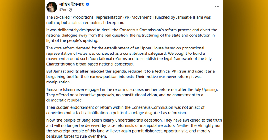 নাহিদ ইসলাম আরও বলেন, ‘জামায়াতে ইসলামী কখনোই প্রকৃত অর্থে সংস্কার আলোচনায় অংশ নেয়নি; না জুলাই অভ্যুত্থানের আগে, না পরে। তারা কোনো সময় সংবিধানভিত্তিক প্রস্তাব দেয়নি, কোনো গণতান্ত্রিক ভিশন উপস্থাপন করেনি; এমনকি গণতান্ত্রিক প্রজাতন্ত্র গঠনের প্রতিও কোনো অঙ্গীকার প্রকাশ করেনি।’