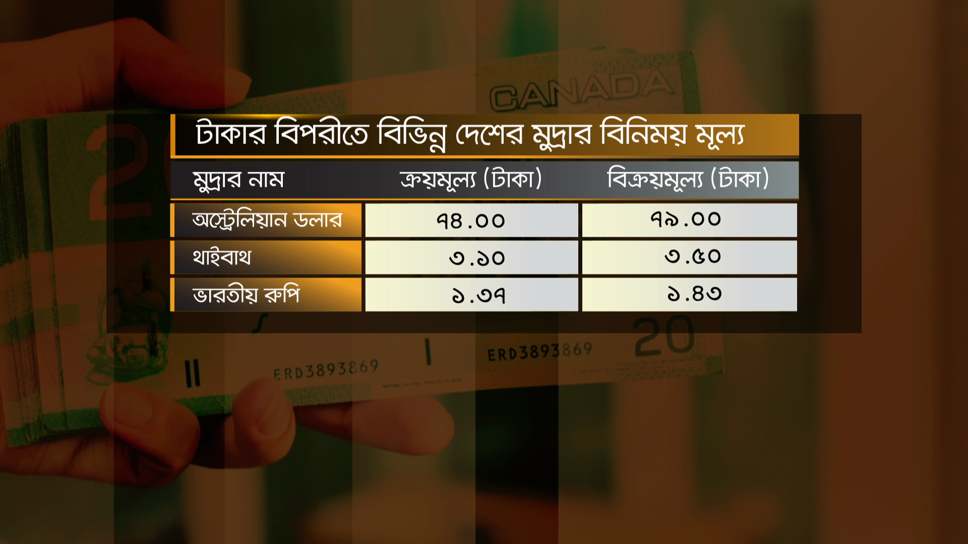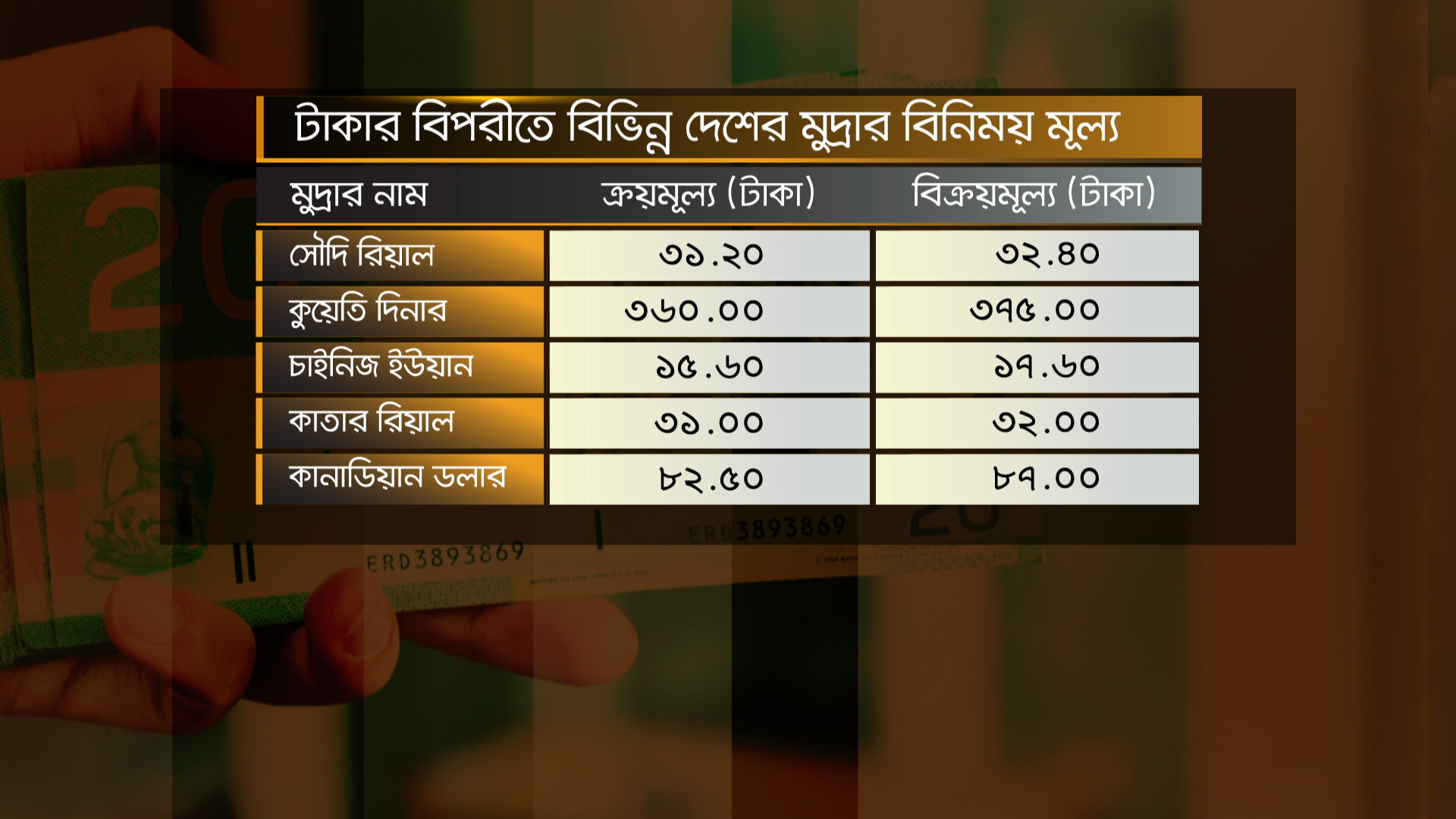 মঙ্গলবার টাকার বিপরীতে বিভিন্ন দেশের মুদ্রার বিনিময় মূল্য