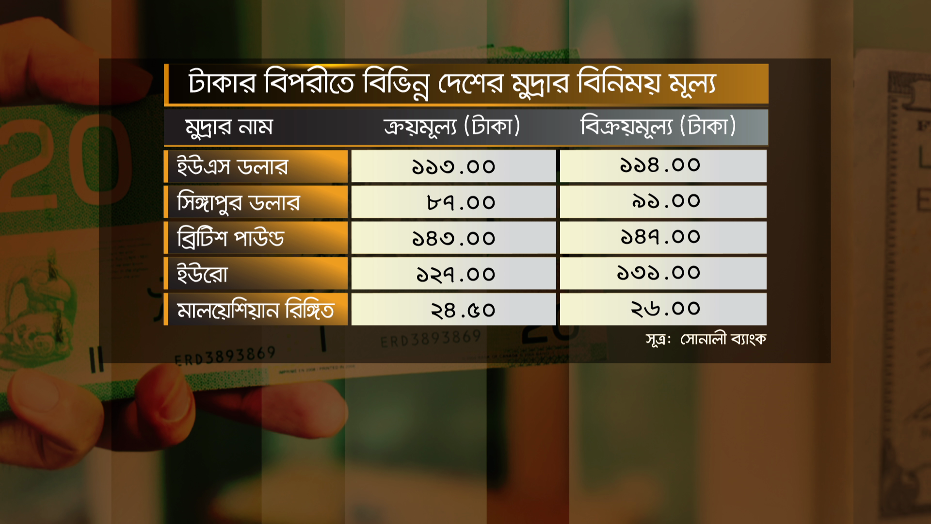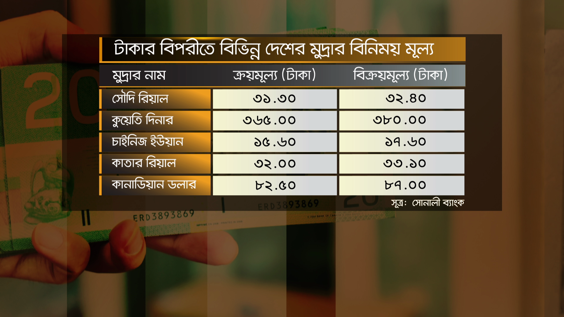 সোমবার টাকার বিপরীতে বিভিন্ন দেশের মুদ্রার বিনিময় মূল্য