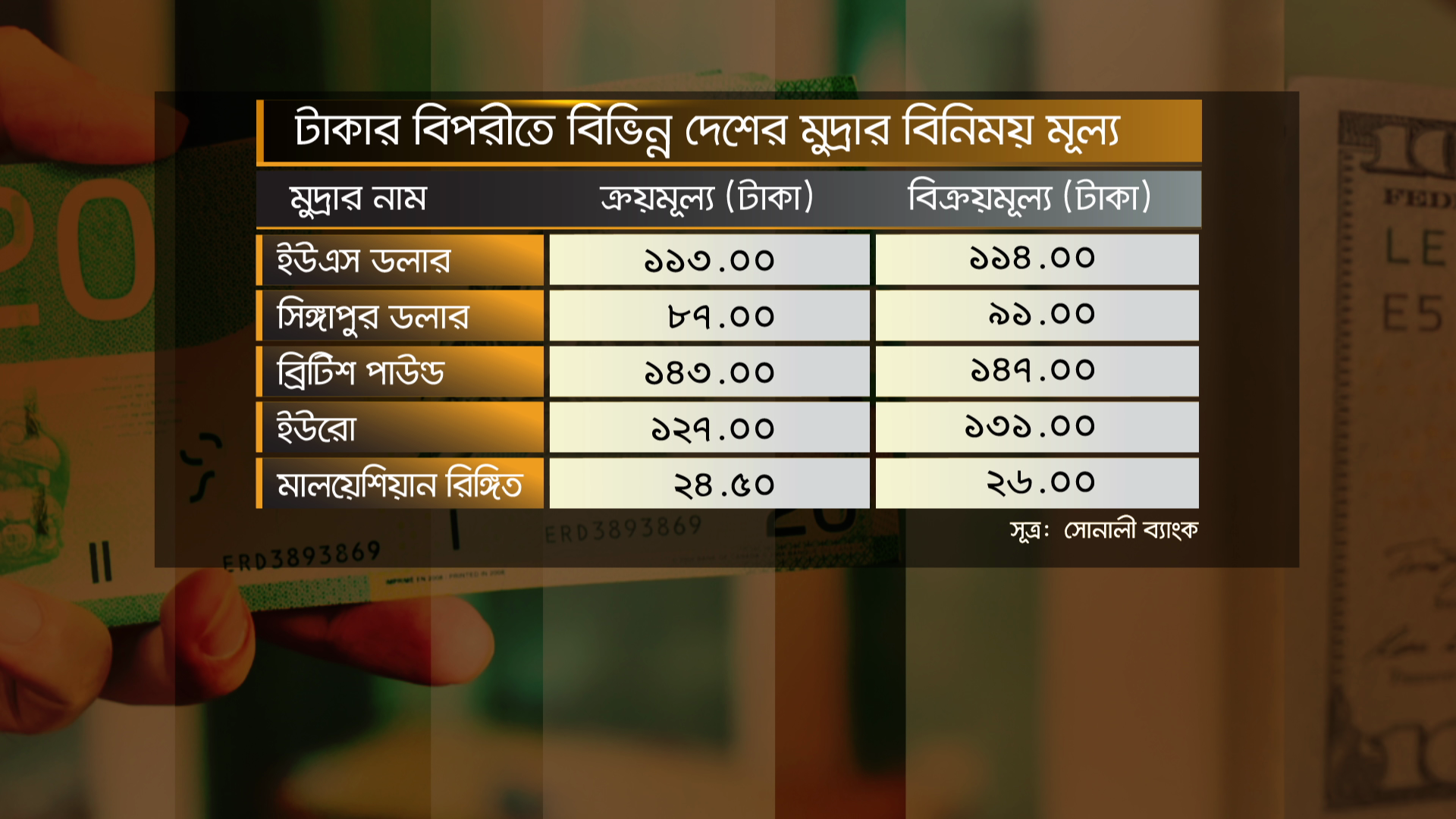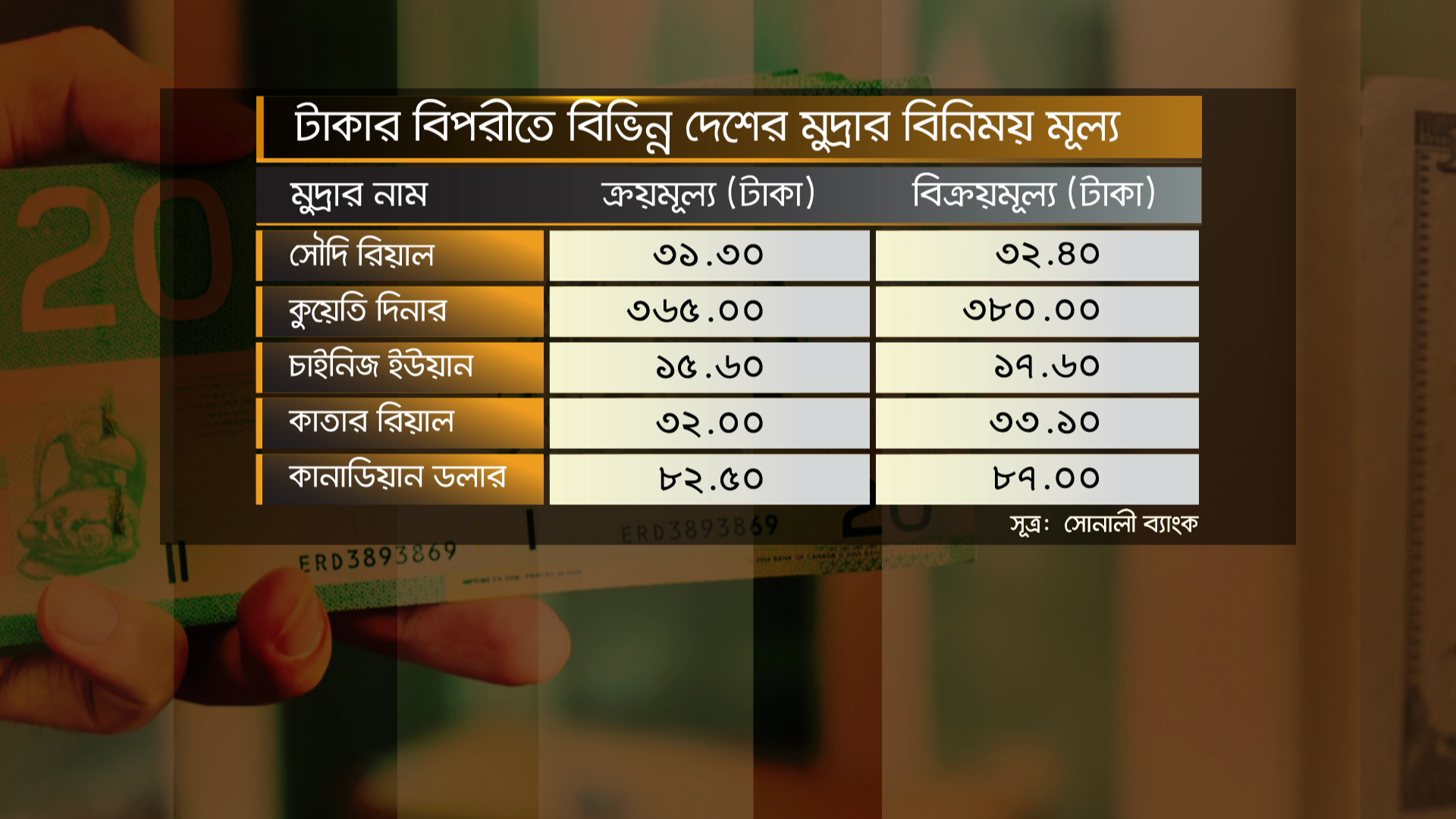 মঙ্গলবার টাকার বিপরীতে বিভিন্ন দেশের মুদ্রার বিনিময় মূল্য