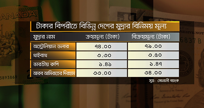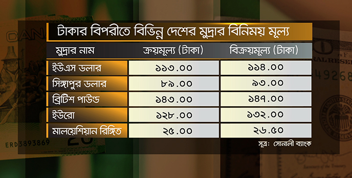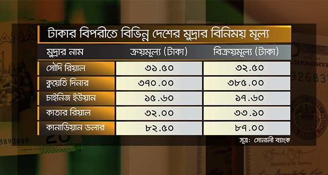 মঙ্গলবার টাকার বিপরীতে বিভিন্ন দেশের মুদ্রার বিনিময় মূল্য