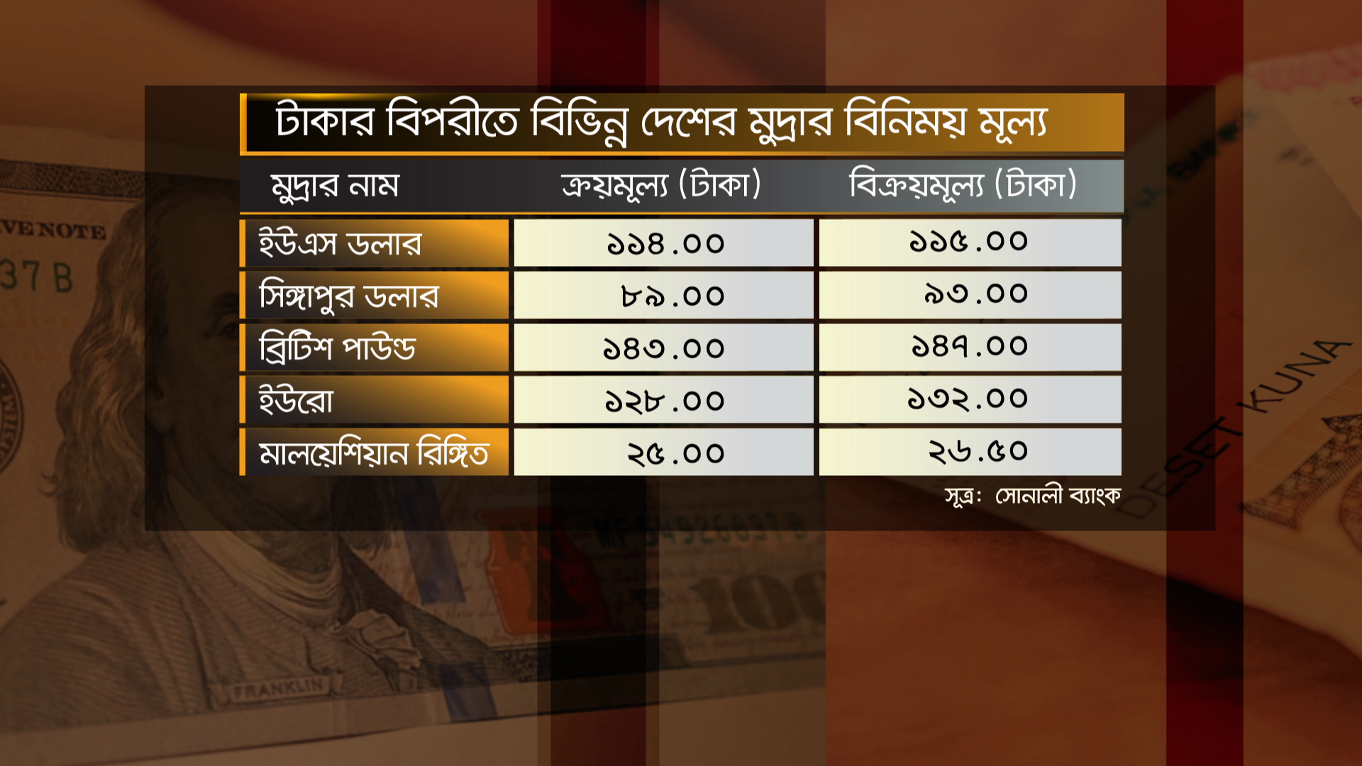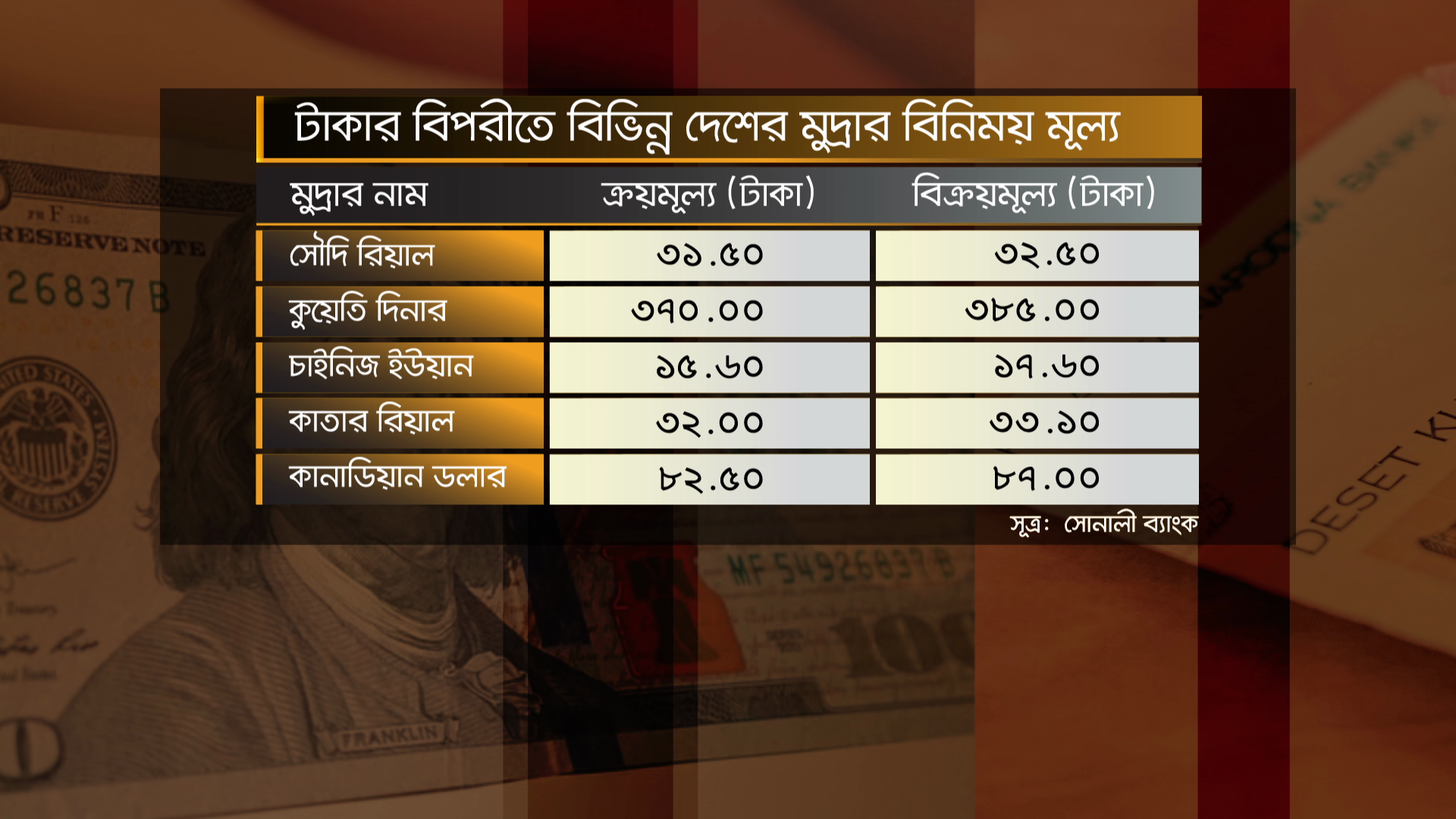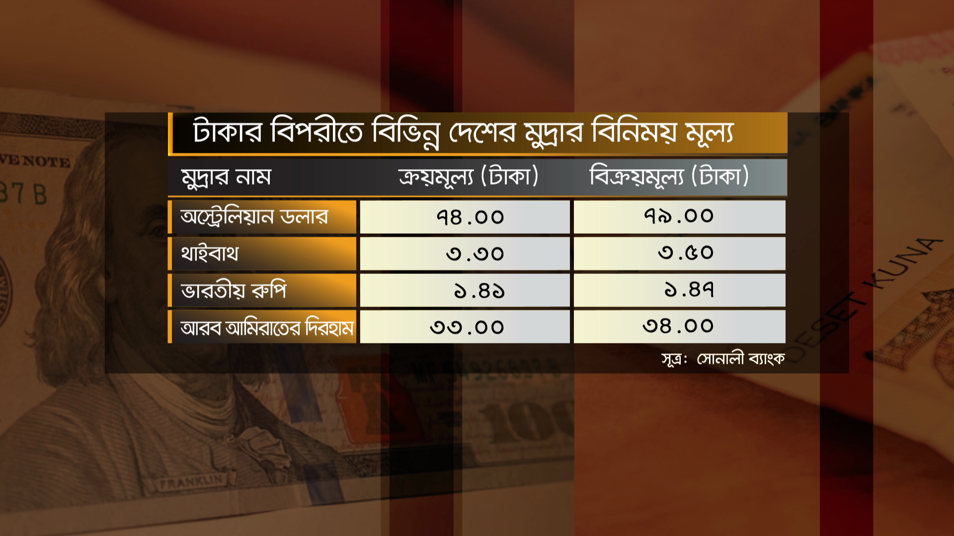 শুক্রবার (২ ফেব্রুয়ারি) টাকার বিপরীতে বিভিন্ন দেশের মুদ্রার বিনিময় মূল্য