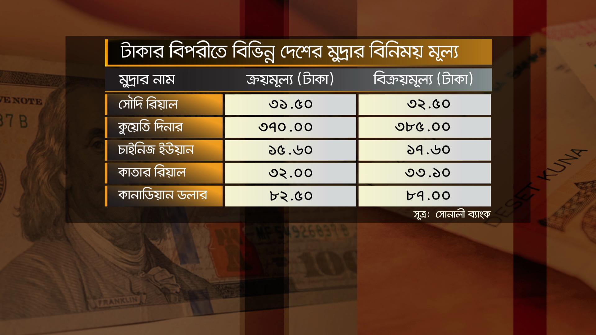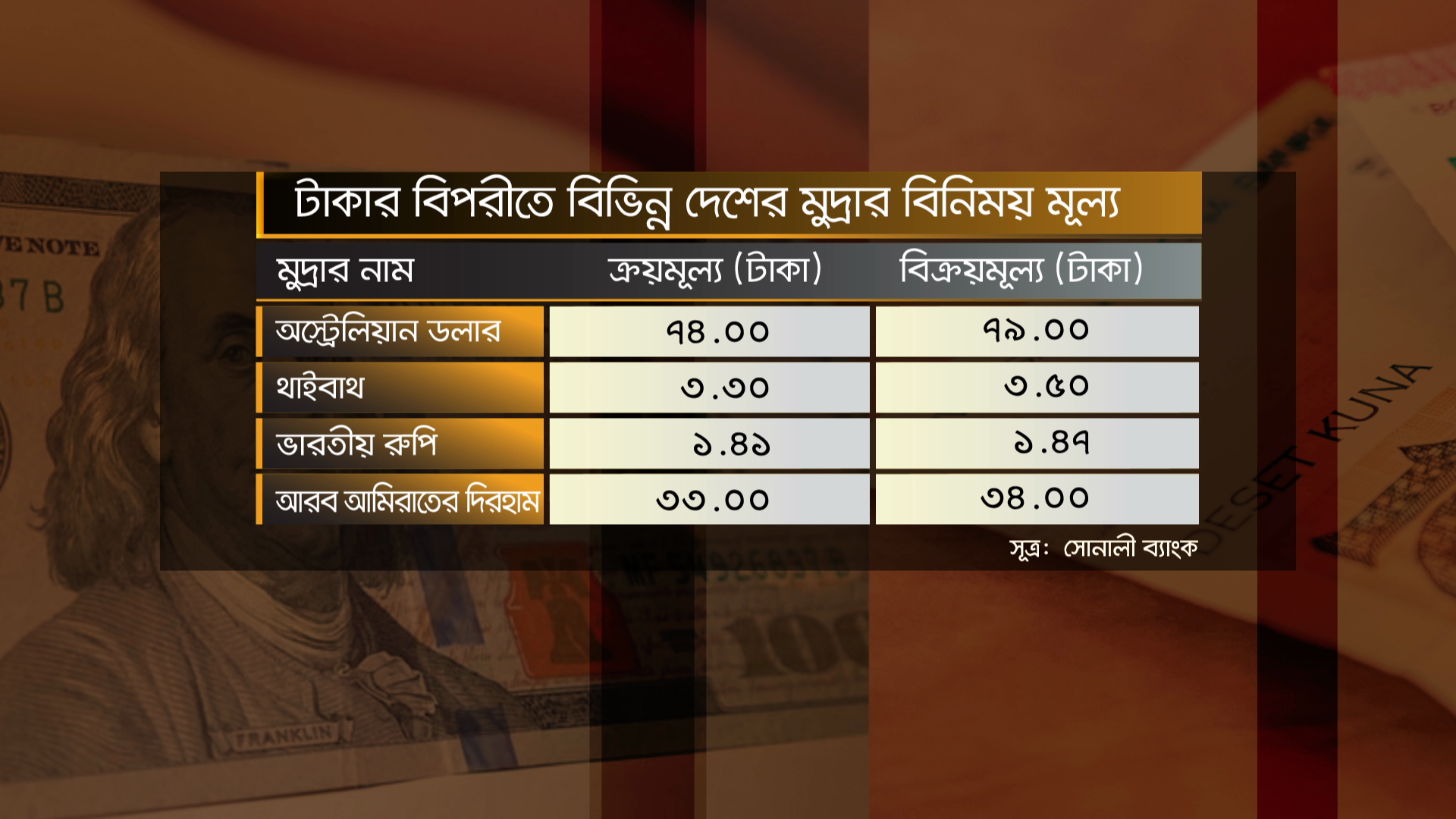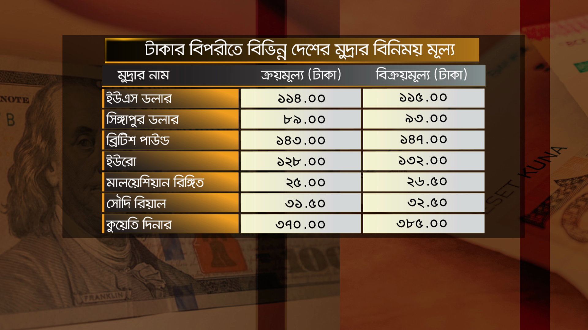 মঙ্গলবার টাকার বিপরীতে বিভিন্ন দেশের মুদ্রার বিনিময় মূল্য