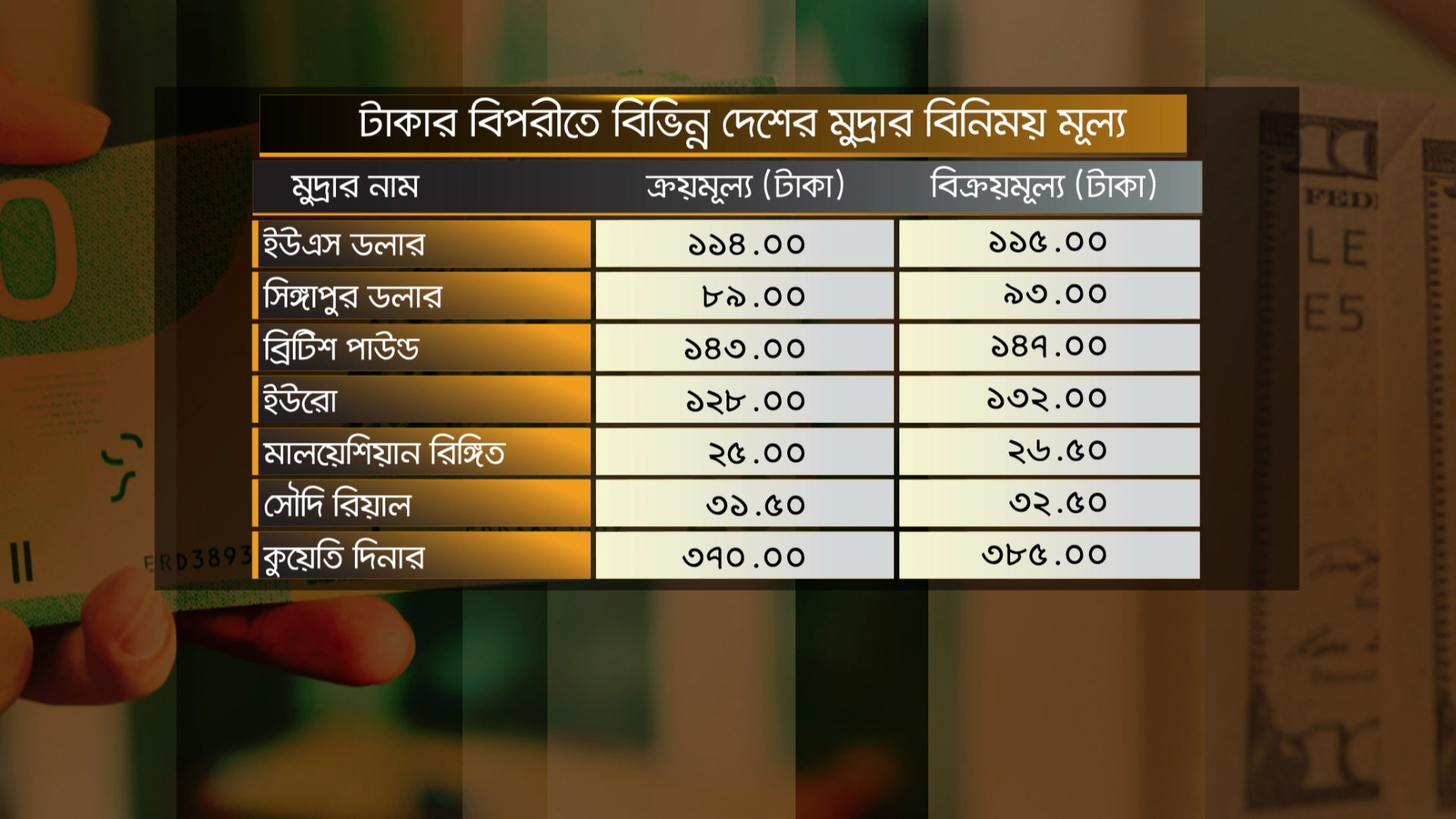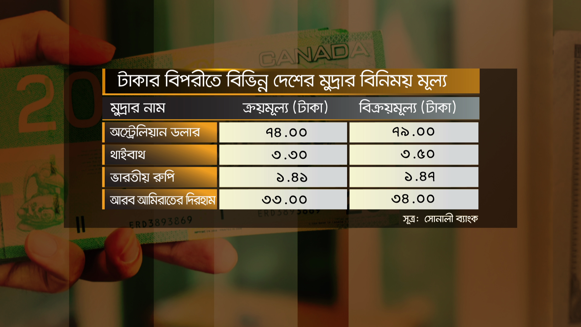 বুধবার টাকার বিপরীতে বিভিন্ন দেশের মুদ্রার বিনিময় মূল্য