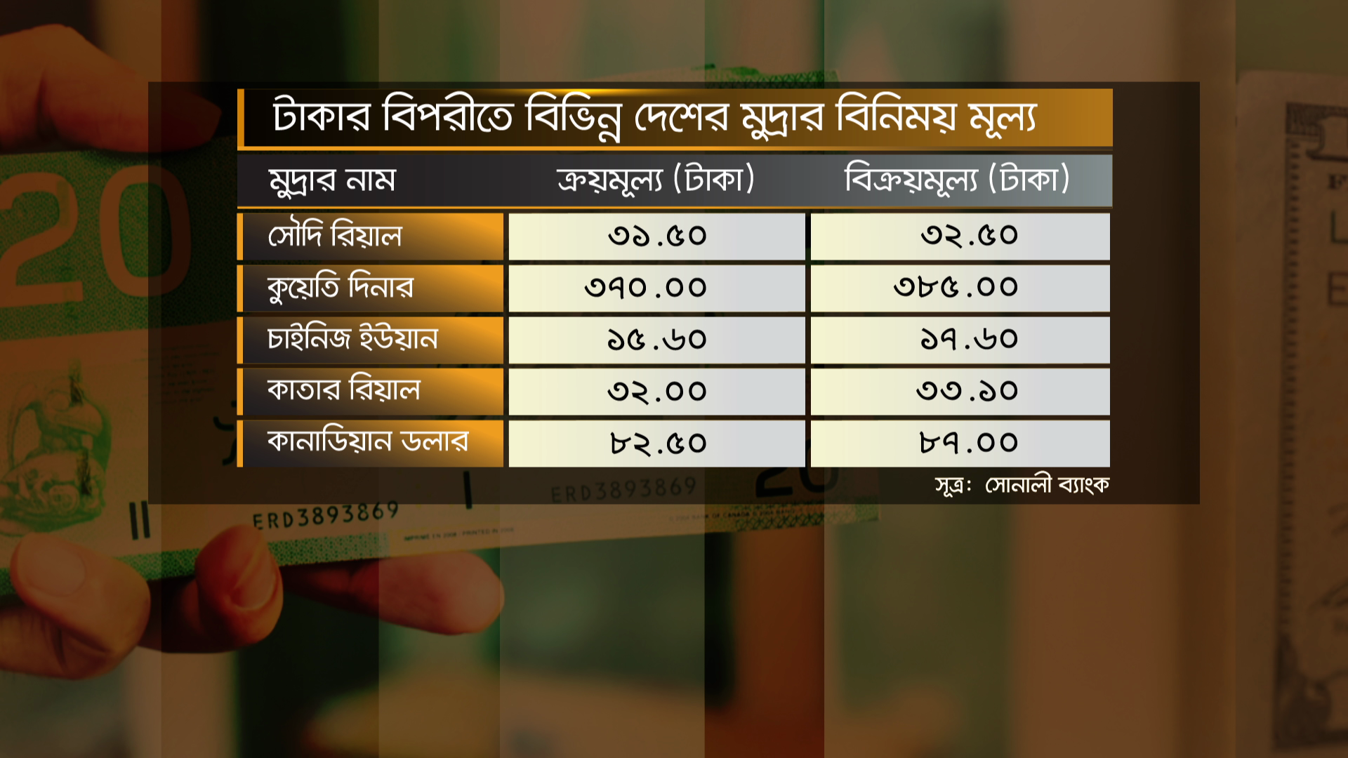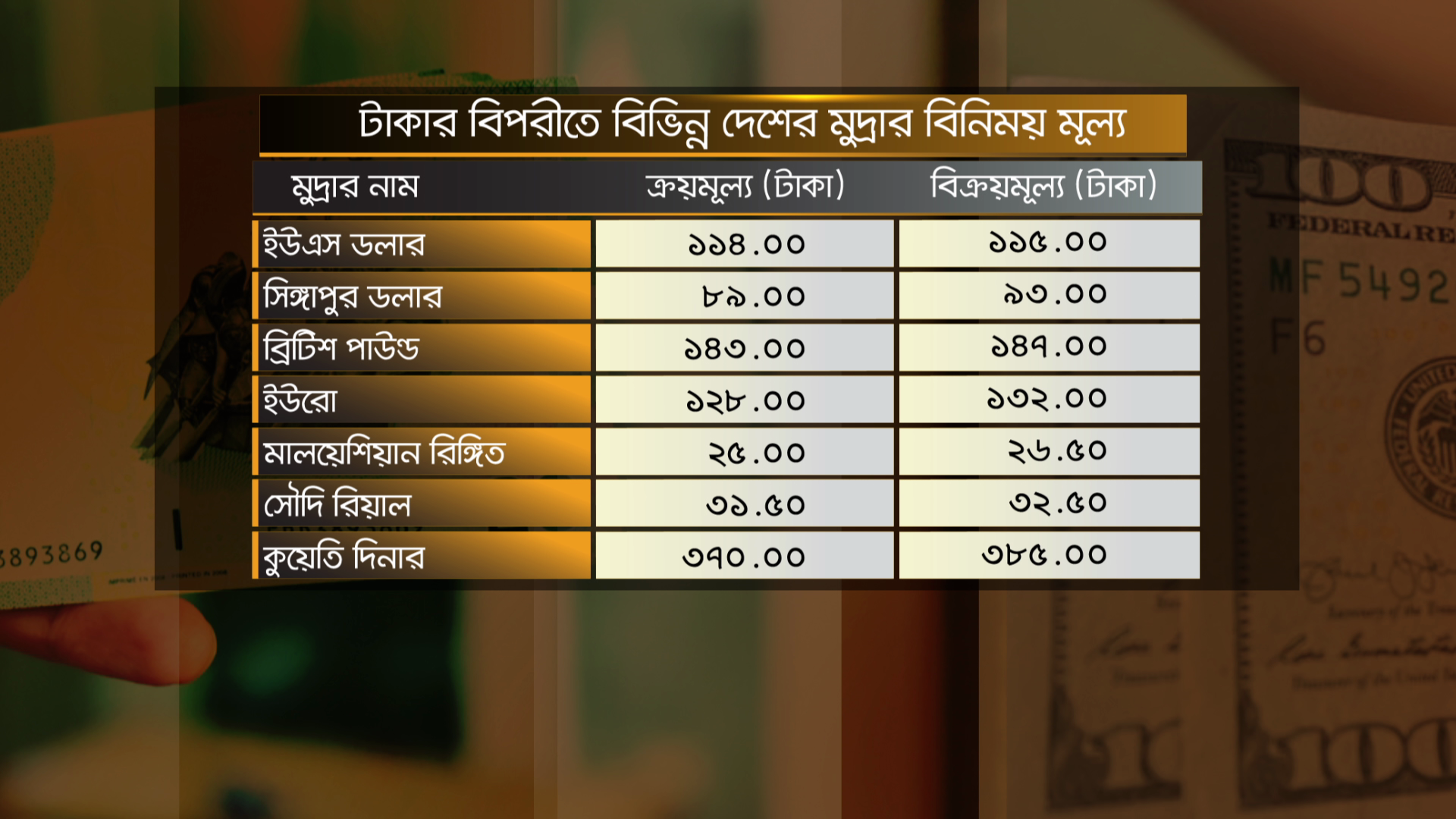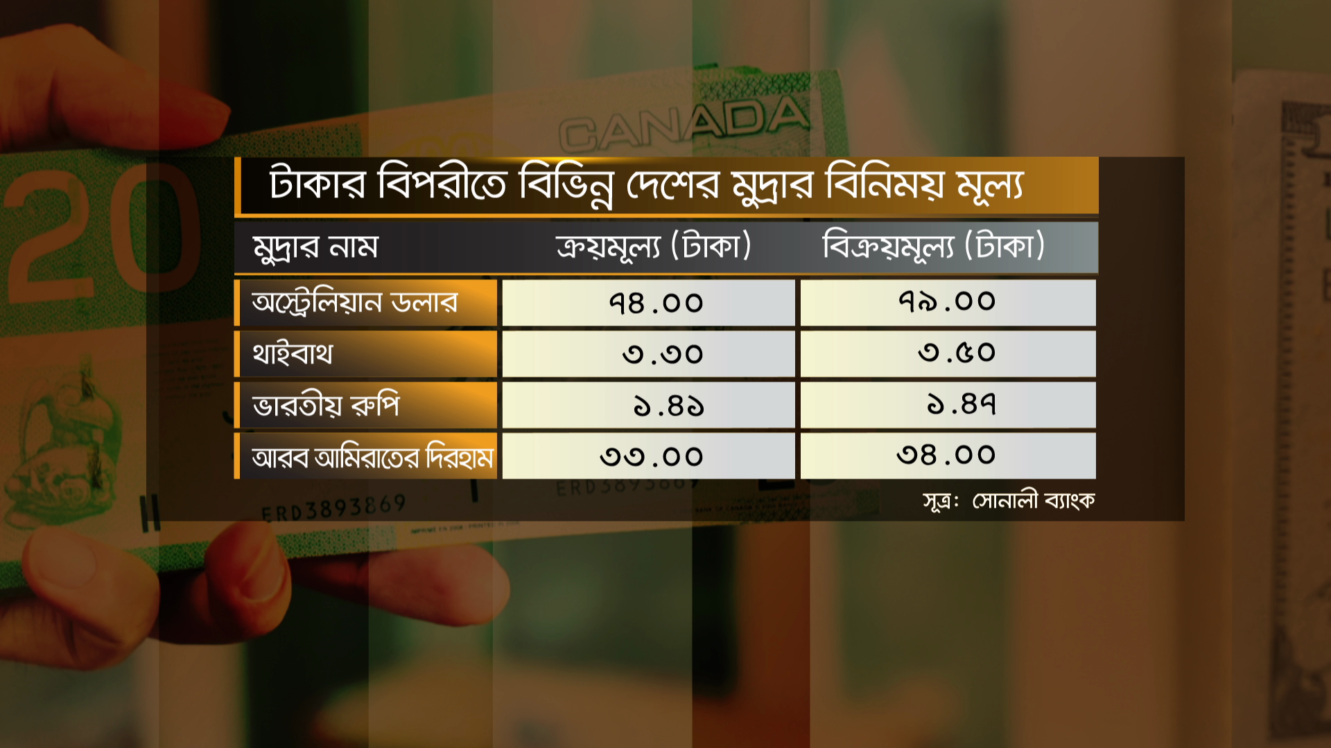 রোববার টাকার বিপরীতে বিভিন্ন দেশের মুদ্রার বিনিময় মূল্য
