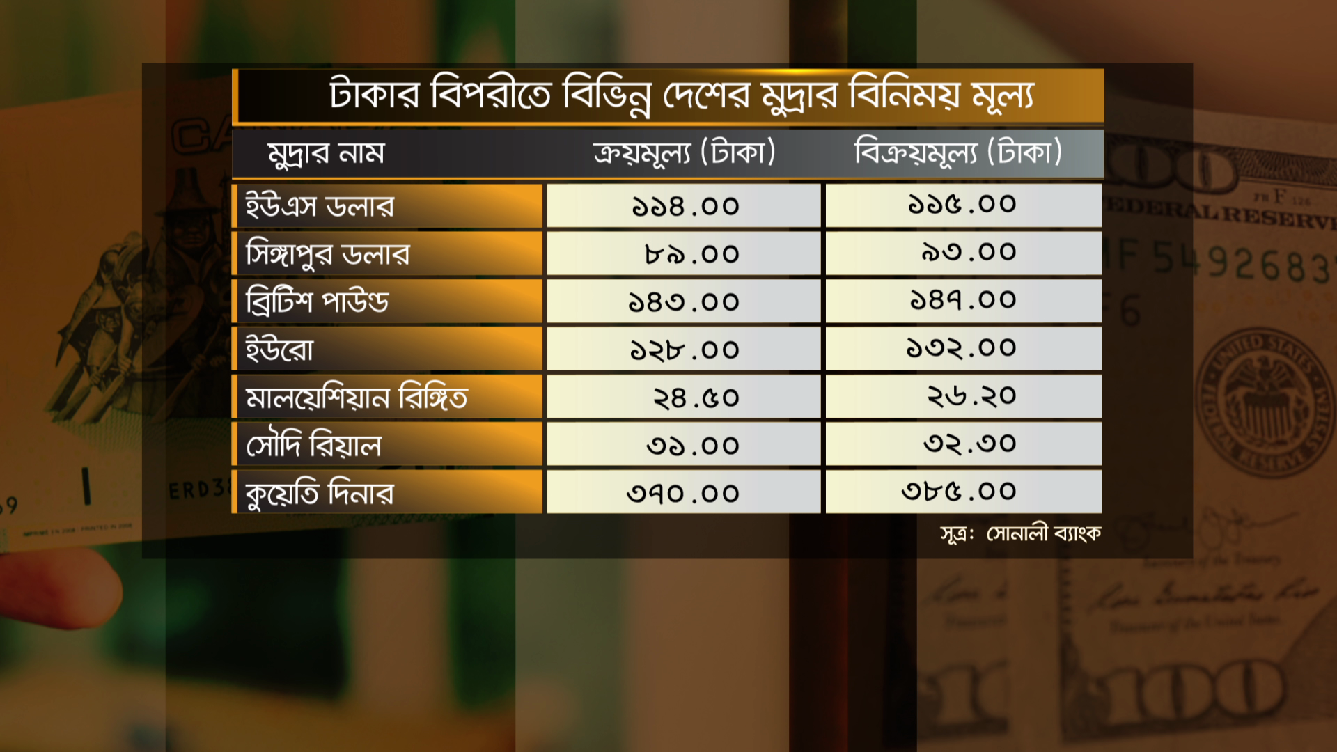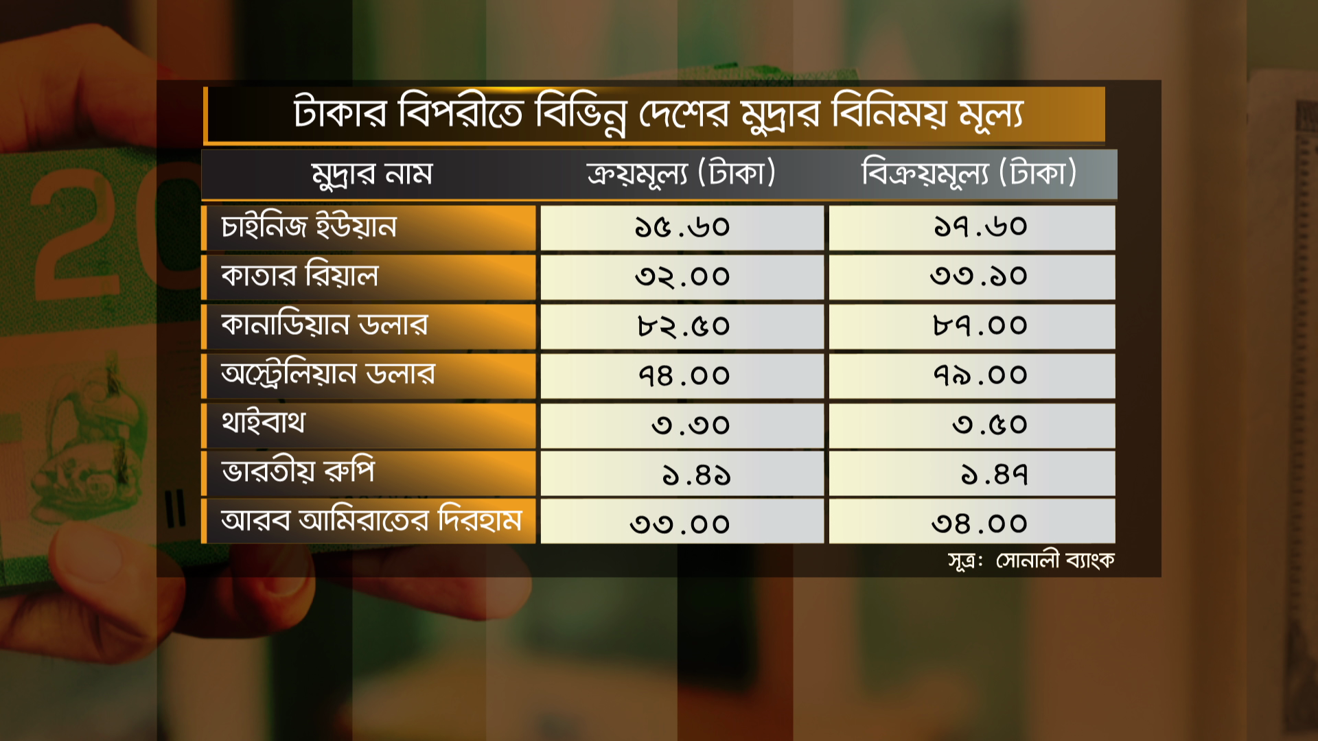 বৃহস্পতিবার টাকার বিপরীতে বিভিন্ন দেশের মুদ্রার বিনিময় মূল্য