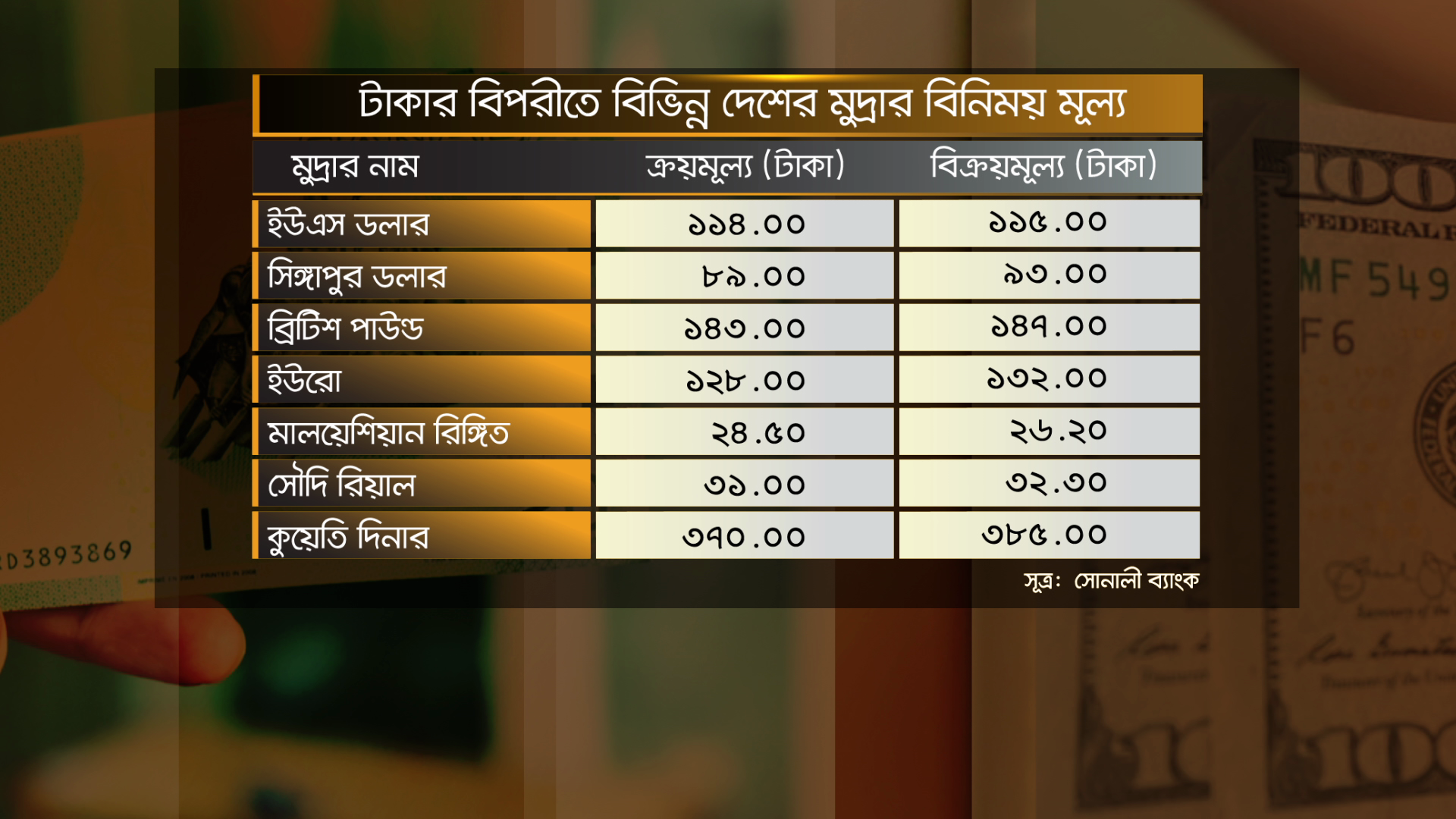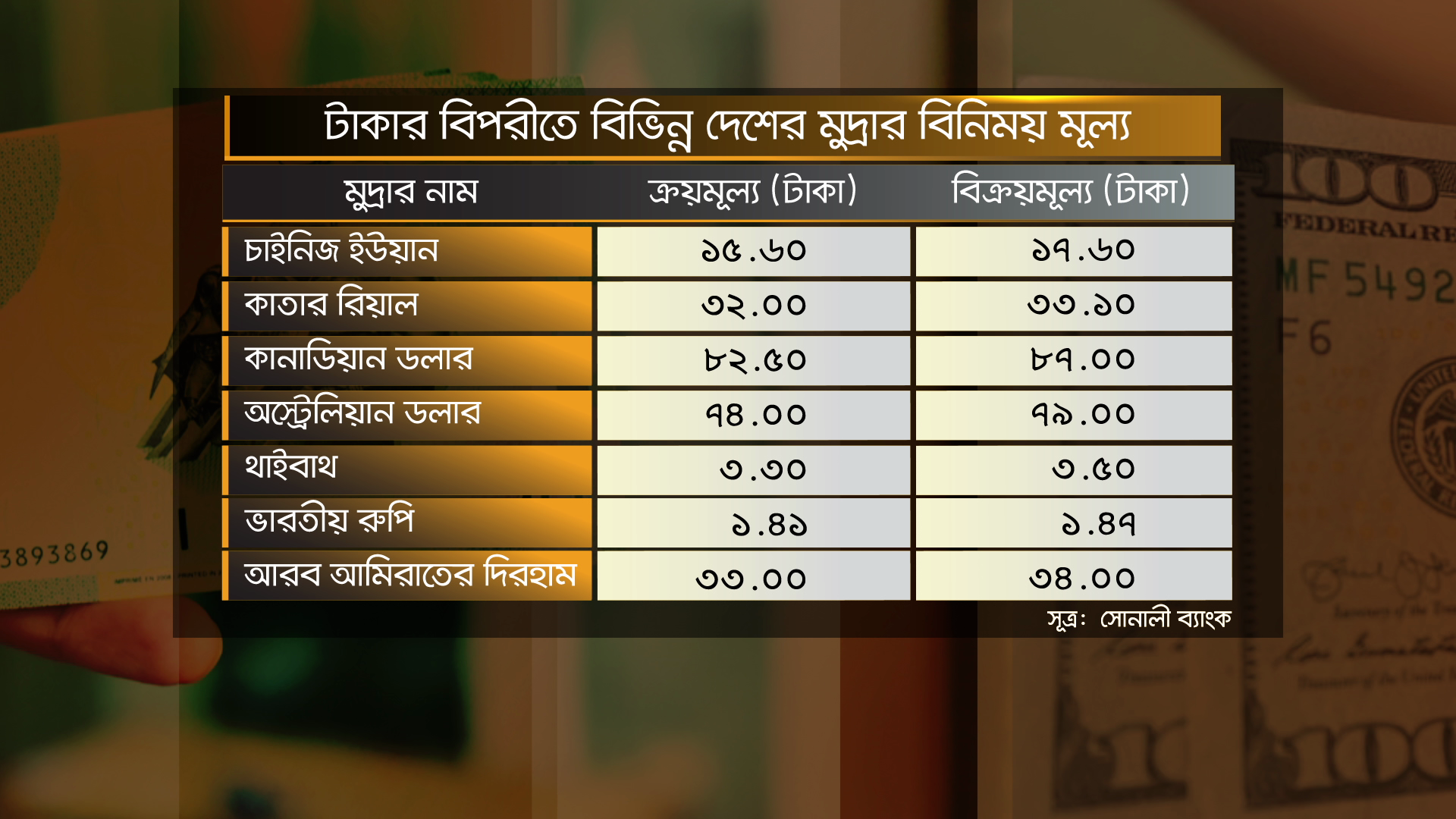 সোমবার টাকার বিপরীতে বিভিন্ন দেশের মুদ্রার বিনিময় মূল্য