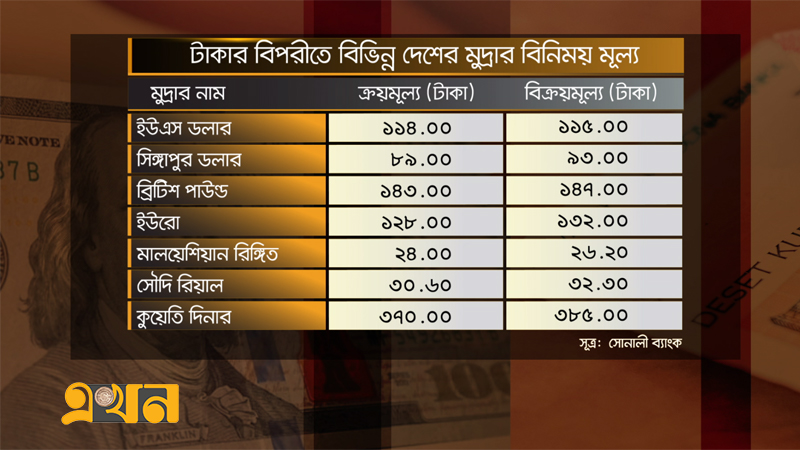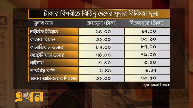 টাকার বিপরীতে বিভিন্ন দেশের মুদ্রার বিনিময় মূল্য। ছবি: এখন টিভি