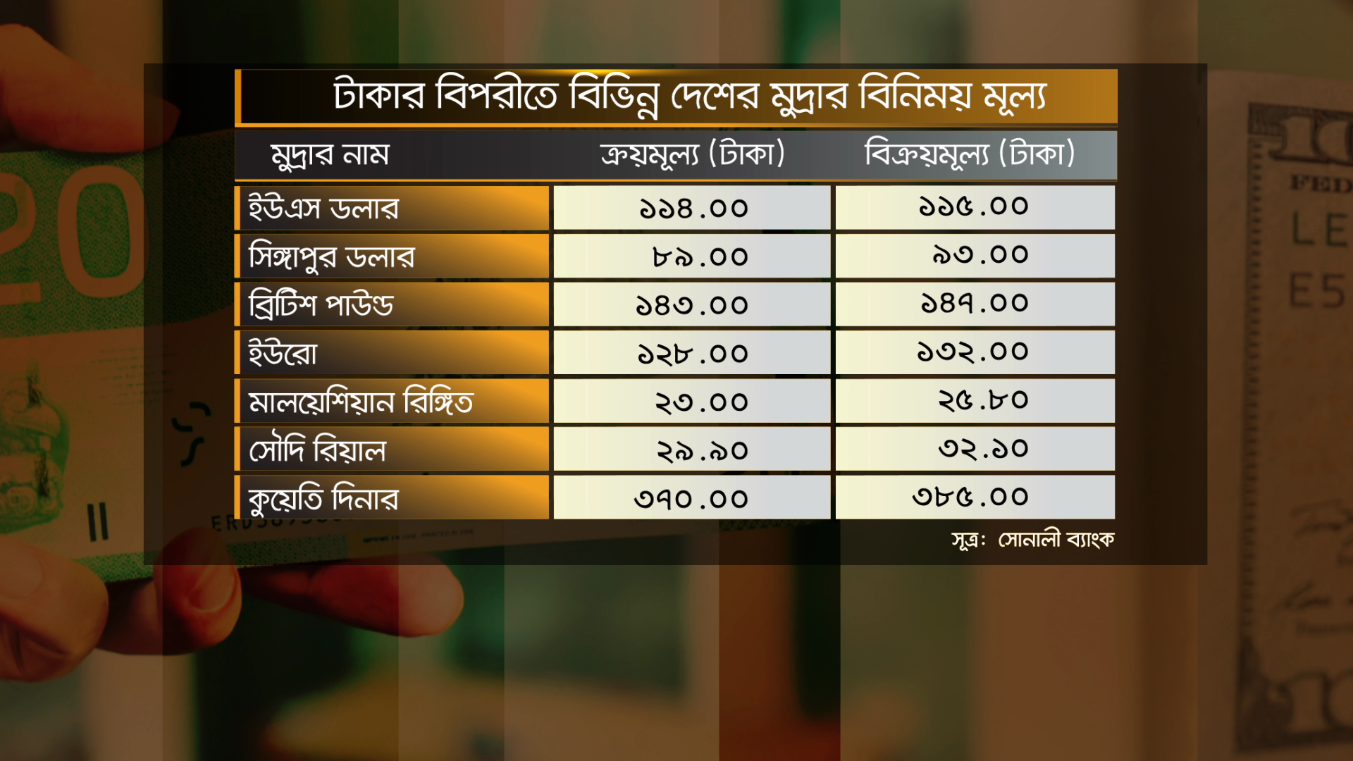 মঙ্গলবার টাকার বিপরীতে বিভিন্ন দেশের মুদ্রার বিনিময় মূল্য