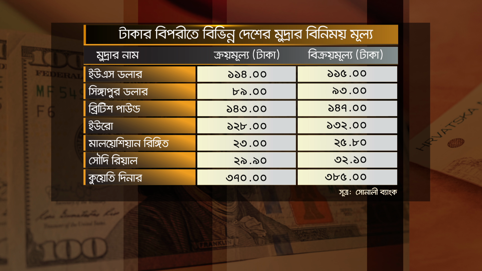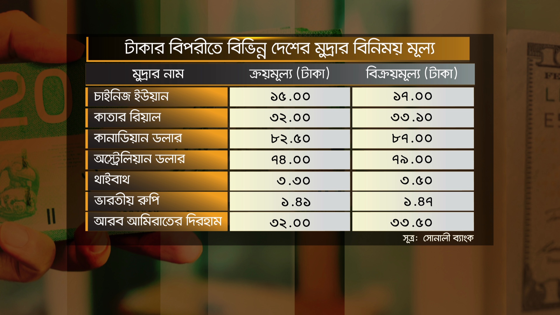 সোমবার টাকার বিপরীতে বিভিন্ন দেশের মুদ্রার বিনিময় মূল্য