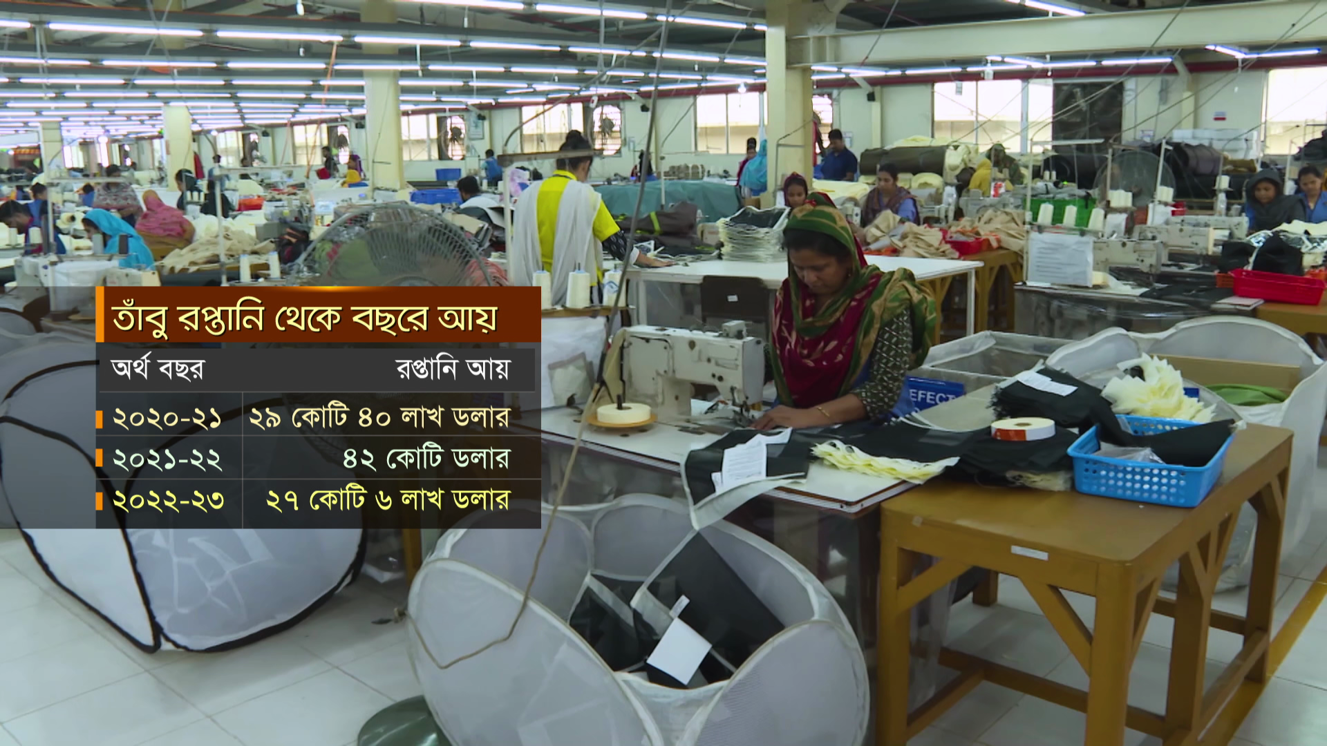 রপ্তানি উন্নয়ন ব্যুরোর হিসাবে, ২০২০-২১ অর্থবছরে বাংলাদেশ তাঁবু রপ্তানিতে আয় করে ২৯ কোটি ৪০ লাখ ডলার। ২০২১- ২২ অর্থবছরে আয় করে ৪২ কোটি মার্কিন ডলার। তবে ২০২২-২৩ অর্থবছরে যুদ্ধ ও মন্দায় তা কমে গিয়ে দাঁড়ায় ২৭ কোটি ৬ লাখ ডলারে।