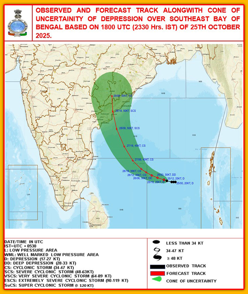 ভারতের আবহাওয়া দপ্তর জানিয়েছে, গভীর নিম্নচাপটি (Cyclone ‘Montha’) গত ৬ ঘণ্টায় প্রায় ১০ কিলোমিটার বেগে পশ্চিম-উত্তরপশ্চিম দিকে অগ্রসর হয়েছে। বাংলাদেশ সময় সন্ধ্যা ৬টার মধ্যে এটি ঘূর্ণিঝড়ে রূপ নিতে পারে।