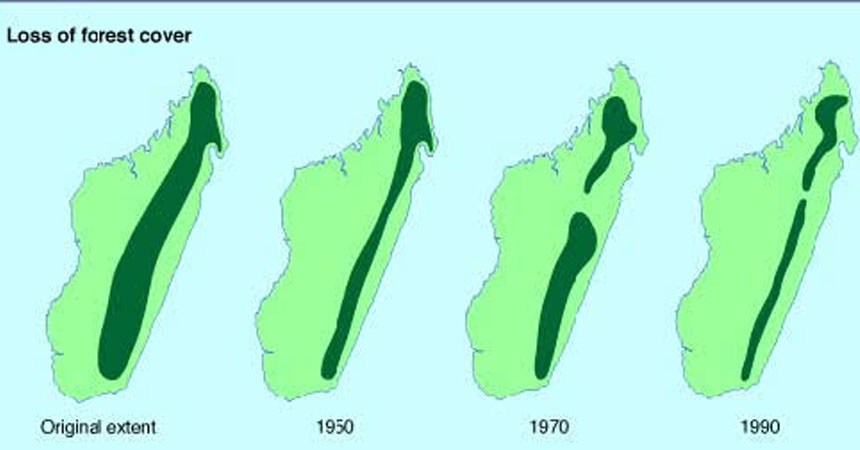 ১৯৫০ সালে যেখানে মাদাগাস্কারের পুরো আয়তনের ২৭ শতাংশ বনভূমিতে সম্পূর্ণ ঢাকা ছিল, ২০০০ সালে এসে তা দাঁড়ায় মাত্র ১৬ শতাংশে। মাত্র ৫০ বছরে প্রায় ৪০ শতাংশ বনভূমি হারিয়ে যায়, যা খুবই শঙ্কার কারণ। আগেই বলা হয়েছে, মাদাগাস্কার হলো পৃথিবীর অন্যতম বৈচিত্র্যময় প্রাণী আর উদ্ভিদের আবাসস্থল। তাই বনভূমি রক্ষা না করলে বৈচিত্র্যময় এই প্রাণগুলো অচিরেই হারিয়ে যাবে।
