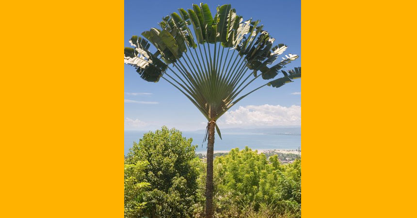 উদ্ভিদটিকে ‘ট্রাভেলার ট্রি’ বলা হয়, কারণ এর পাতার গোড়ায় থলের মতো স্থানে গাছ জরুরি সময়ে ব্যবহারের জন্য পানি জমিয়ে রাখে। ফলে ভ্রমণকারীরা যদি কখনো ভ্রমণে গিয়ে তৃষ্ণায় ভোগেন এবং আশেপাশে যদি কোনো ট্রাভেলার পাম ট্রি থাকে, তারা সহজেই তাদের তৃষ্ণা দূর করতে পারেন। এরা প্রায় ২৬ ফুট পর্যন্ত লম্বা হতে পারে। গাছের মাথায় কলাপাতার মতো পাতা মেলে থাকা ময়ূরের পাখার মতো হয়ে সজ্জিত থাকে।