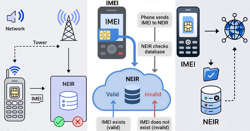 IMEI হলো একটি তথ্য, আর NEIR হলো সেই তথ্য জমা রাখার ঘর। যখন আপনি ফোনে সিম কার্ড ঢোকান, তখন মোবাইল নেটওয়ার্ক আপনার ফোনের IMEI নম্বরটি সংগ্রহ করে NEIR সিস্টেমে পাঠিয়ে দেয়। NEIR তখন যাচাই করে দেখে যে এই IMEI নম্বরটি তাদের ডাটাবেজে (বৈধ তালিকায়) আছে কি না।