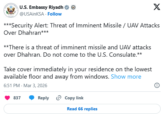 সামাজিক যোগাযোগমাধ্যম এক্সে দেয়া এক পোস্টে দূতাবাসটি জানায়, ধাহরান এলাকায় তাৎক্ষণিক হামলা ও ড্রোন (ইউএভি) আক্রমণের হুমকি রয়েছে। এ কারণে কাউকে যুক্তরাষ্ট্রের কনস্যুলেটে না আসার পরামর্শ দেয়া হয়েছে।