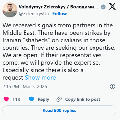 জেলেনস্কি অনলাইনে বলেন, ইউক্রেন তাদের অভিজ্ঞতা ভাগাভাগি করতে প্রস্তুত এবং উপসাগরীয় দেশগুলোর সঙ্গে প্রযুক্তি ও অস্ত্র বিনিময়ে উন্মুক্ত। গত সপ্তাহে ইরানি ড্রোন হামলার লক্ষ্যবস্তু হওয়া দেশগুলোর কথাও তিনি উল্লেখ করেন।
