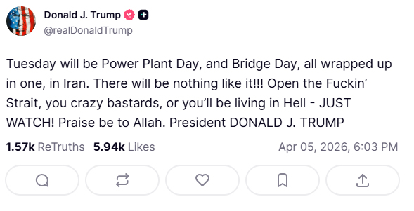 আজ (রোববার, ৫ এপ্রিল) ট্রুথ সোশ্যালে দেয়া এক পোস্টে তিনি লেখেন, ‘অভিশপ্ত হরমুজ প্রণালি খুলে দাও, তোমরা পাগল ইরানিরা, নইলে তোমাদের নরকে বাস করতে হবে—দেখে নিও! সকল প্রশংসা আল্লাহর।’