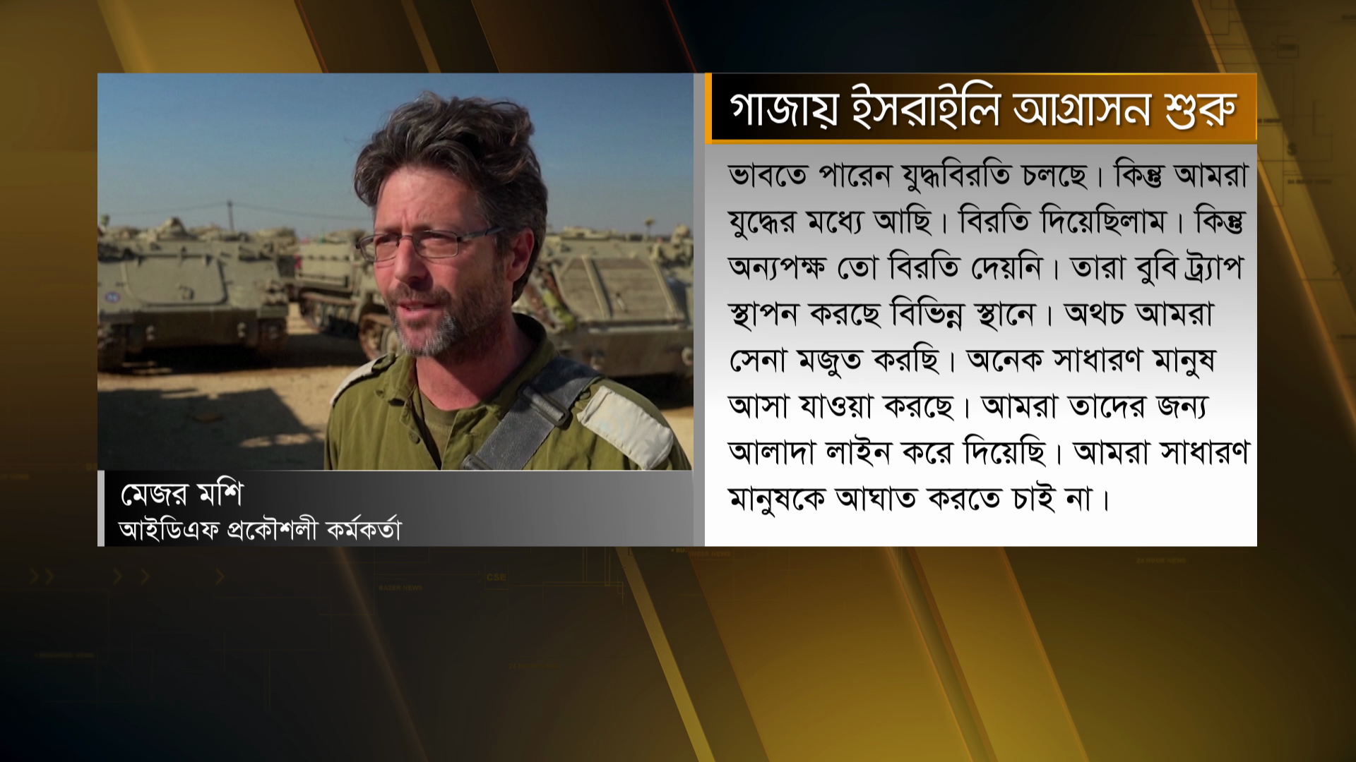 ইসরাইলি সেনাবাহিনী আইডিএফ জানায়, হামাসের ঘাঁটি লক্ষ্য করে গাজার বিভিন্ন স্থানে আকাশ থেকে হামলা চালানো হবে। ইসরাইলি প্রধানমন্ত্রী বেনিয়ামিন নেতানিয়াহু জানিয়েছেন, নিজেদের লক্ষ্য স্থির আছে তাদের। বন্দিদের মুক্ত করা হবে, হামাস নির্মূল করা হবে, সেইসঙ্গে গাজা যেন কোনদিন ইসরাইলের জন্য হুমকি না হয়, তা নিশ্চিত করা হবে।