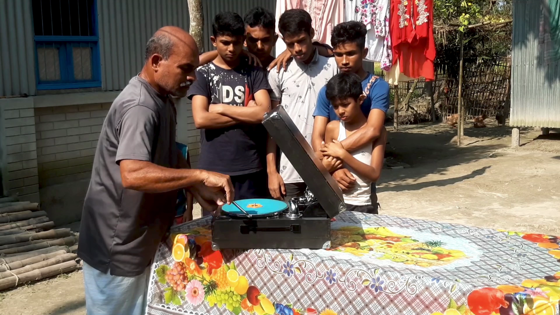 কুড়িগ্রামে নতুন প্রজন্মকে গ্রামোফোন সম্পর্কে জানান দিচ্ছেন আমজাদ হোসেন।