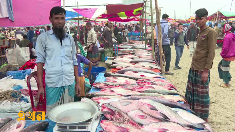 বগুড়ার পোড়াদহ মেলায় মাছ নিয়ে এসেছেন বিক্রেতারা। ছবি: এখন টিভি