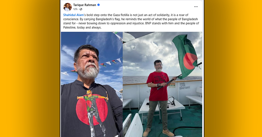 বিএনপির ভারপ্রাপ্ত চেয়ারম্যান তার পোস্টে বলেন, ‘গাজাগামী ফ্লোটিলায় শহিদুল আলমের পদক্ষেপ কেবল সংহতি প্রকাশ নয়, এটি বিবেকের গর্জন। বাংলাদেশের পতাকা বহন করে তিনি বিশ্বকে স্মরণ করিয়ে দিয়েছেন যে এ দেশের মানুষ কখনো নিপীড়ন ও অন্যায়ের কাছে মাথা নত করে না।’