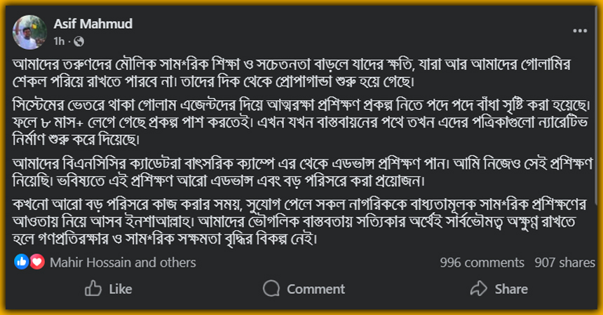 আসিফ বলেন, ‘আমাদের তরুণদের মৌলিক সামরিক শিক্ষা ও সচেতনতা বাড়লে যাদের ক্ষতি, যারা আর আমাদের গোলামির শেকল পরিয়ে রাখতে পারবে না। তাদের দিক থেকে প্রোপাগান্ডা শুরু হয়ে গেছে।