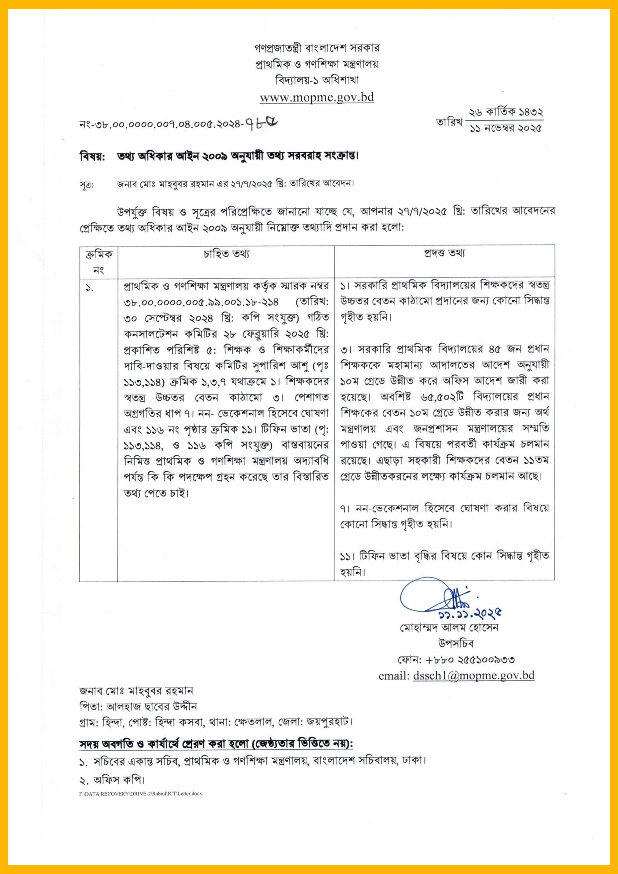 ২৮ জুলাই এক বিজ্ঞপ্তিতে প্রাথমিক ও গণশিক্ষা মন্ত্রণালয় জানিয়েছিল, সরকার দেশের ৬৫ হাজার ৫০২টি প্রধান শিক্ষক পদের বেতন স্কেল বিদ্যমান ১১তম গ্রেড (প্রশিক্ষণপ্রাপ্ত) এবং ১২তম গ্রেড (প্রশিক্ষণবিহীন) থেকে ১০ম গ্রেডে উন্নীতকরণে সম্মতি দেয়।