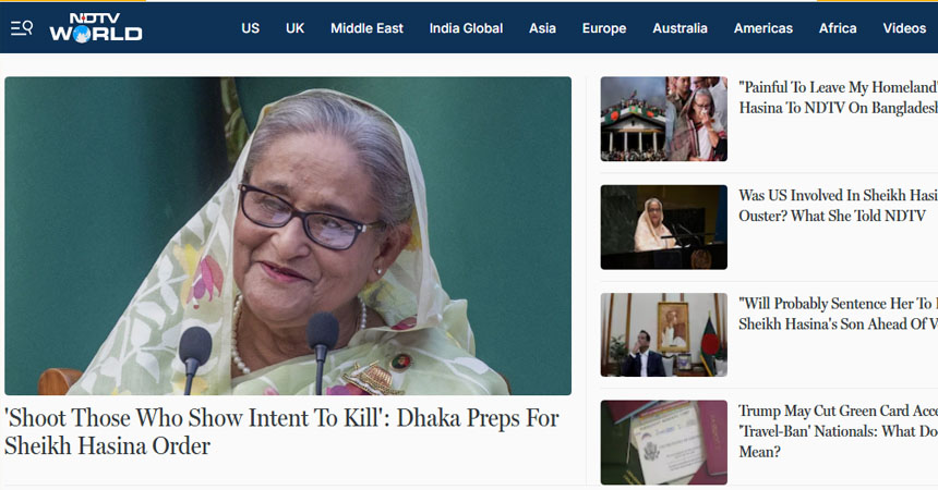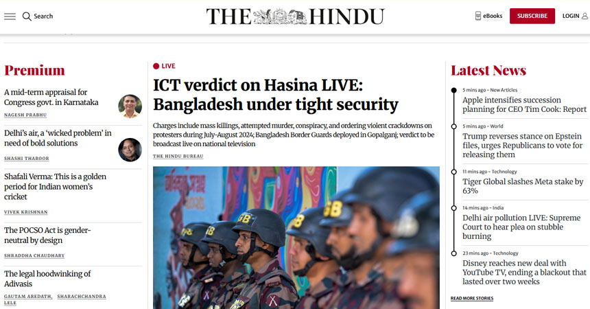 এনডিটিভি’র শীর্ষ পাঁচটি খবরে চারটিই শেখ হাসিনার রায়কে কেন্দ্র করে। দ্য হিন্দু রায়ের অগ্রগতি নিয়ে ‘লাইভ’ আপডেট দিচ্ছে। হিন্দুস্তান টাইমস–এর শীর্ষ দুই খবরের একটিতে স্থান পেয়েছে এই ইস্যু।