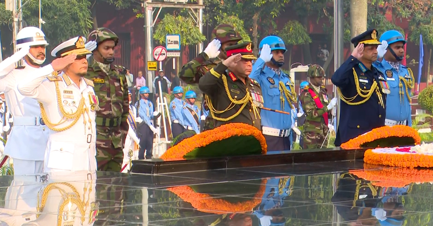 এরপর সেনাবাহিনী প্রধান জেনারেল ওয়াকার-উজ-জামান, নৌবাহিনী প্রধান এডমিনাল মোহাম্মদ নাজমুল হাসান এবং বিমান বাহিনী প্রধান এয়ার চিফ মার্শাল হাসান মাহমুদ খাঁন নিজ নিজ বাহিনীর পক্ষ থেকে শিখা অনির্বাণে পুষ্পস্তবক অর্পণ করেন।