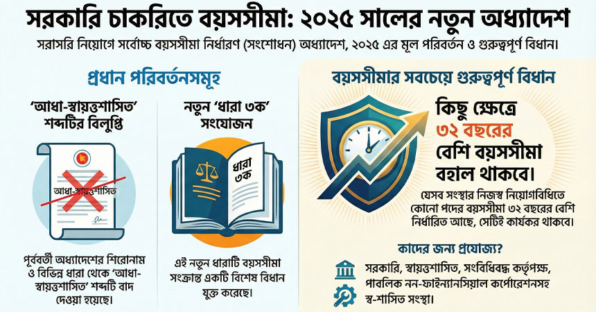 উত্তর: না, এই অধ্যাদেশটি শুধুমাত্র চাকরিতে প্রবেশের (Entry Age) বয়স নিয়ে। অবসরের বয়সসীমা (Retirement Age) বর্তমানে যা আছে তা-ই বহাল থাকবে।