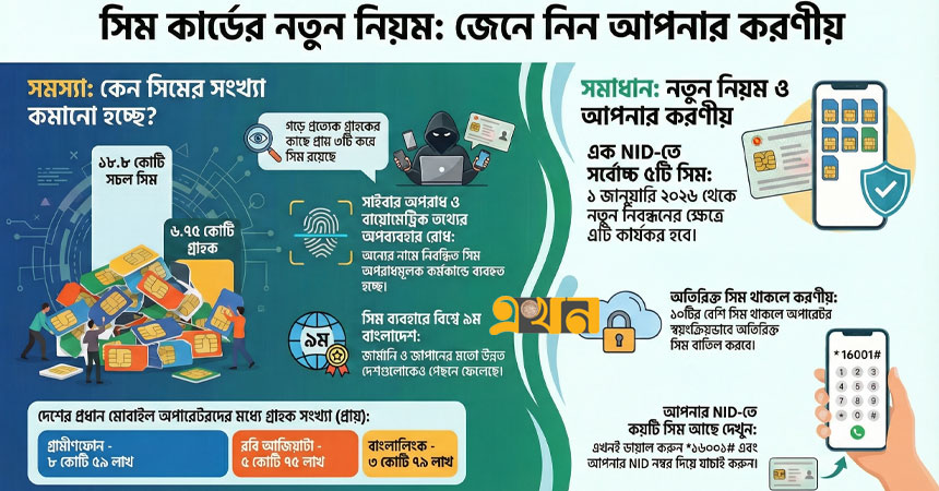 সিমের সংখ্যায় লাগাম! ১ জানুয়ারি থেকে এক এনআইডিতে ৫টির বেশি সিম নয়। সুরক্ষিত থাকুন, নিরাপদ টেলিকম সেবা নিশ্চিত করুন। |ছবি: এখন টিভি