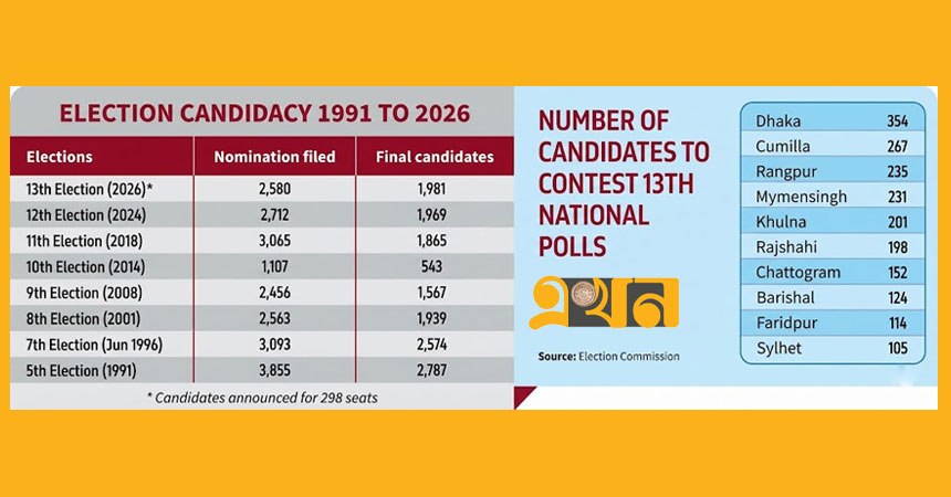 নির্বাচন কমিশনের তথ্য অনুযায়ী, প্রার্থীসংখ্যা ও আসনভিত্তিক প্রতিদ্বন্দ্বিতার দিক থেকে ঢাকা বিভাগ শীর্ষে রয়েছে। রাজধানীর একাধিক আসনে ১০ বা ১০ এর অধিক সংখ্যক প্রার্থী প্রতিদ্বন্দ্বিতা করছেন। এর মধ্যে ঢাকা-১২ আসনে সর্বোচ্চ ১৫ জন প্রার্থী প্রতিদ্বন্দ্বিতায় রয়েছেন—যা দেশজুড়ে সবচেয়ে বেশি।