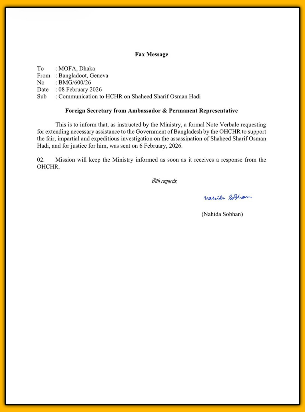 বিজ্ঞপ্তিতে বলা হয়, শহীদ শরিফ ওসমান হাদির হত্যাকাণ্ডের তদন্ত এবং ন্যায়বিচার প্রতিষ্ঠায় জাতিসংঘের মানবাধিকার বিষয়ক হাইকমিশনারের কার্যালয়ের সহযোগিতা চেয়েছে বাংলাদেশ।