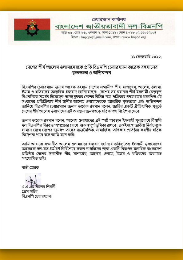 বিজ্ঞপ্তিতে বলা হয়, ‘আলেম ওলামাদের এই স্পষ্ট অবস্থান ইসলামী মূল্যবোধে বিশ্বাসী দল বিএনপির বিরুদ্ধে অপপ্রচার রোধে গুরুত্বপূর্ণ ভূমিকা রাখবে। একইসঙ্গে জাতীয় নির্বাচনকে সামনে রেখে দেশের জনগণ তাদের রাজনৈতিক, সামাজিক, অধিকার প্রতিষ্ঠায় করণীয় সঠিক নির্দেশনা পাবে বলে আমি মনে করি।’