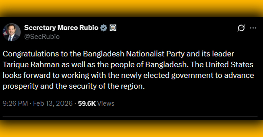 জয়ী দল হিসেবে বিএনপি ও চেয়ারম্যান তারেক রহমানকে অভিনন্দন জানিয়ে রুবিও লিখেছেন, ‘বাংলাদেশ জাতীয়তাবাদী দল ও দলের নেতা তারেক রহমান এবং বাংলাদেশের জনগণকে অভিনন্দন।’