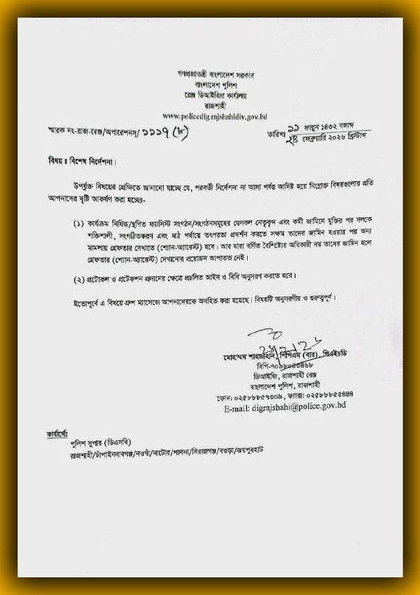 চিঠিতে আরও জানানো হয় যে, ইতিপূর্বেও এ সংক্রান্ত বিষয়ে পুলিশের অভ্যন্তরীণ যোগাযোগের মাধ্যমে সংশ্লিষ্ট কর্মকর্তাদের সতর্ক করা হয়েছিল। বিষয়টিকে অত্যন্ত সংবেদনশীল এবং জরুরি উল্লেখ করে রাজশাহী রেঞ্জের প্রতিটি জেলায় এটি কার্যকর করার নির্দেশ দেয়া হয়েছে।