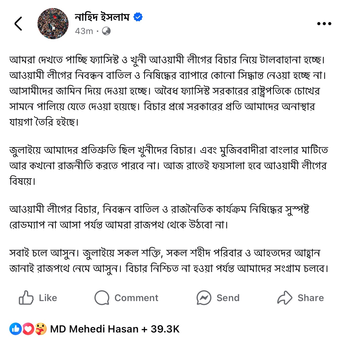 তিনি লেখেন, জুলাইয়ে আমাদের প্রতিশ্রুতি ছিল খুনীদের বিচার। এবং মুজিববাদীরা বাংলার মাটিতে আর কখনও রাজনীতি করতে পারবে না। আজ রাতেই ফয়সালা হবে আওয়ামী লীগের বিষয়ে। আওয়ামী লীগের বিচার, নিবন্ধন বাতিল ও রাজনৈতিক কার্যক্রম নিষিদ্ধের সুস্পষ্ট রোডম্যাপ না আসা পর্যন্ত আমরা রাজপথ থেকে উঠবো না।