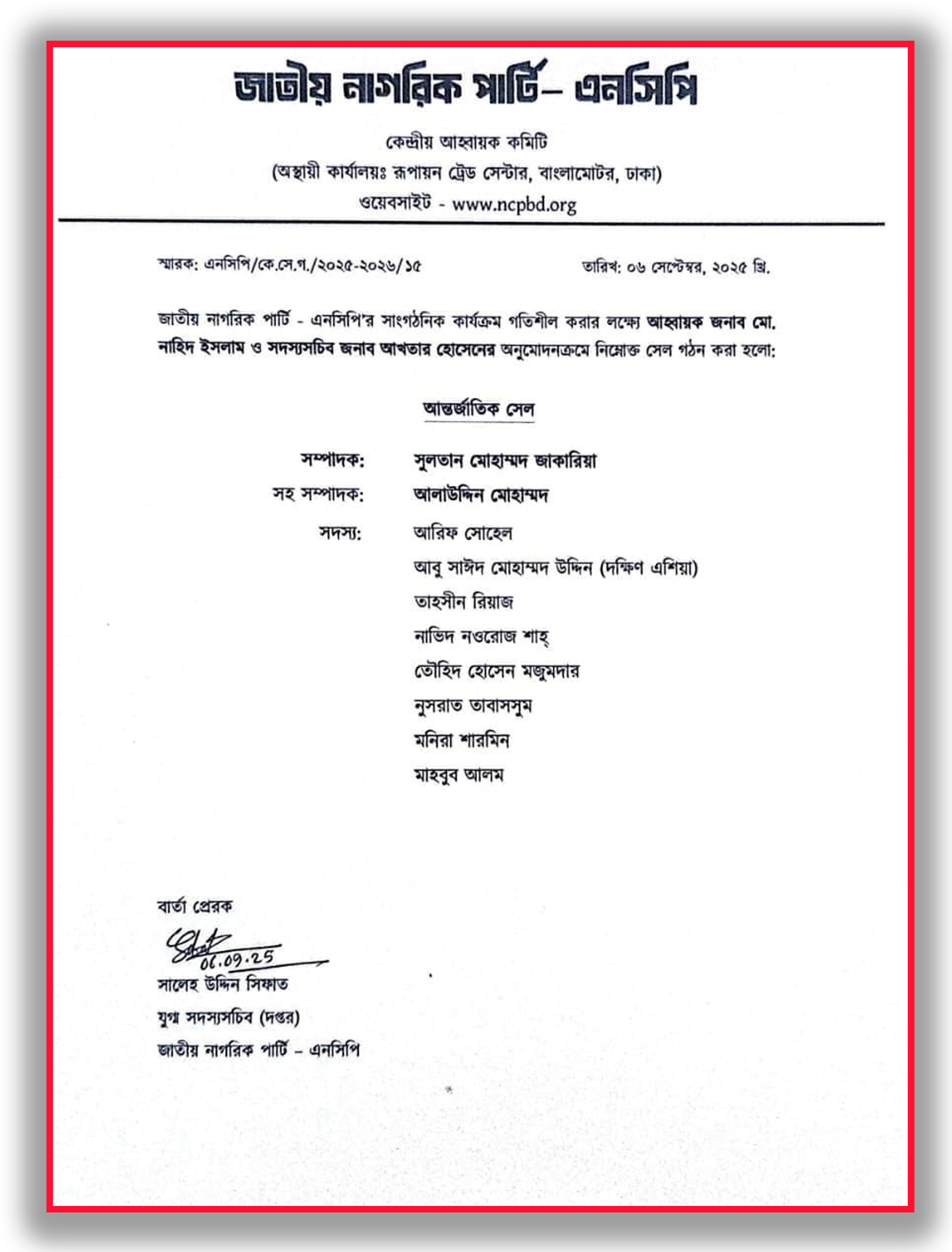 দলটির আহ্বায়ক মো. নাহিদ ইসলাম ও সদস্য সচিব আখতার হোসেন এ কমিটি অনুমোদন দিয়েছেন। গত (শনিবার, ৬ সেপ্টেম্বর) দলটির যুগ্ম সদস্যসচিব (দপ্তর) সালেহ উদ্দিন সিফাতের স্বাক্ষরিত এক বিজ্ঞপ্তিতে এ তথ্য জানানো হয়।