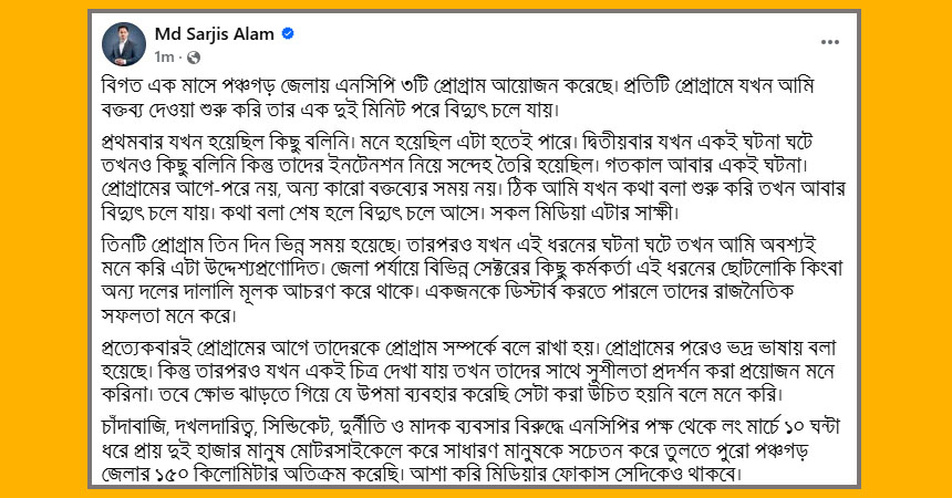 সারজিস আলম বলেন, ‘প্রথমবার যখন এমনটা হয়েছিল, কিছু বলিনি। মনে হয়েছিল এটা কাকতালীয় হতে পারে। দ্বিতীয়বার একই ঘটনা ঘটলেও কিছু বলিনি, তবে তাদের ইনটেনশন নিয়ে সন্দেহ তৈরি হয়। কিন্তু গতকাল আবার একই ঘটনা ঘটেছে—প্রোগ্রামের আগে বা পরে নয়, অন্য কারো বক্তব্যের সময়ও নয়—ঠিক আমি কথা বলা শুরু করলেই বিদ্যুৎ চলে যায়, কথা শেষ হলে আবার চলে আসে। সকল মিডিয়া এর সাক্ষী।’
