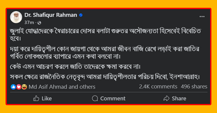 জামায়াত আমির তার পোস্টে লেখেন, জুলাই যোদ্ধাদের স্বৈরাচারের দোসর বলাটা গুরুতর অসৌজন্যতা হিসেবেই বিবেচিত হবে।