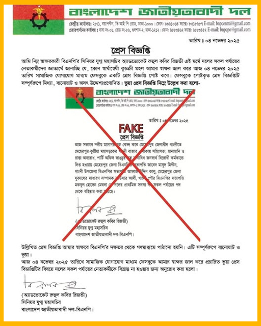 রিজভী আরও বলেন, ‘সামাজিক যোগাযোগ মাধ্যম ফেসবুকে তার স্বাক্ষর জাল করে প্রচারিত ভুয়া প্রেস বিজ্ঞপ্তিটির বিষয়ে দলের সকল পর্যায়ের নেতাকর্মীকে বিভ্রান্ত না হওয়ার জন্য অনুরোধ জানানো হচ্ছে।’