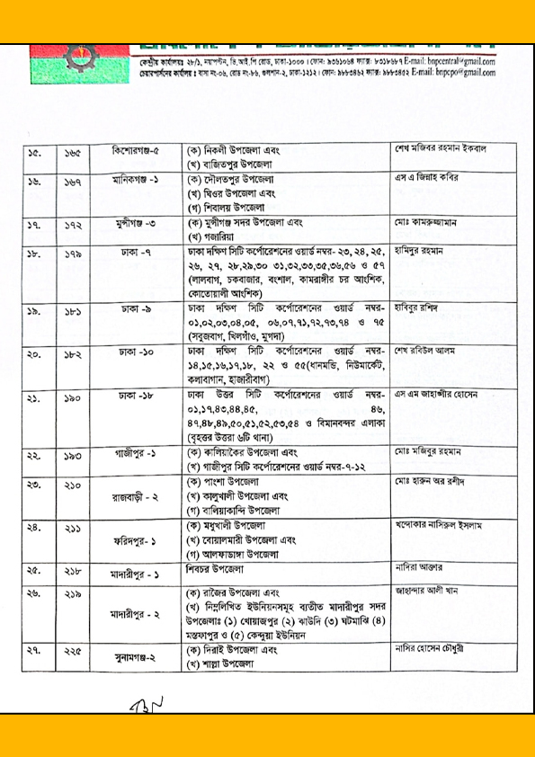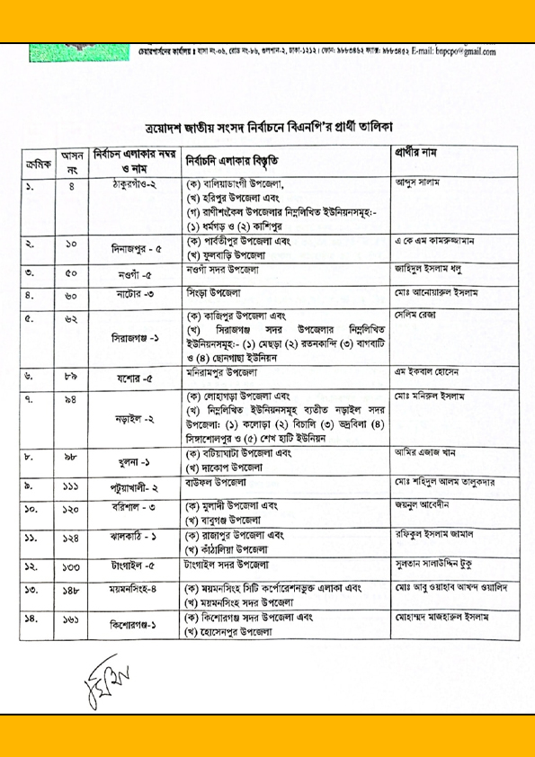 এদের মধ্যে রয়েছেন ঠাকুরগাঁও-২ আসনে ডা. আব্দুস সালাম, দিনাজপুর-৫ এ কে এম কামরুজ্জামান, নওগাঁ-৫ জাহিদুল ইসলাম ধলু, সিরাজগঞ্জ-১ সেলিম রেজা, যশোর-৫ এম ইকবাল হোসেন, নড়াইল-২ মনিরুল ইসলাম, খুলনা-১ আমির এজাজ খান, বরিশাল-৩ জয়নাল আবেদিন, ঝালকাঠি-১ রফিকুল ইসলাম জামাল, টাঙ্গাইল-৫ সুলতান সালাহউদ্দিন টুকু, ময়মনসিংহ-৫ আবু ওয়ালিদ, কিশোরগঞ্জ-১ মো. মাজরুল ইসলাম, কিশোরগঞ্জ-৫ মো. মুজিবুর রহমান ইকবাল।