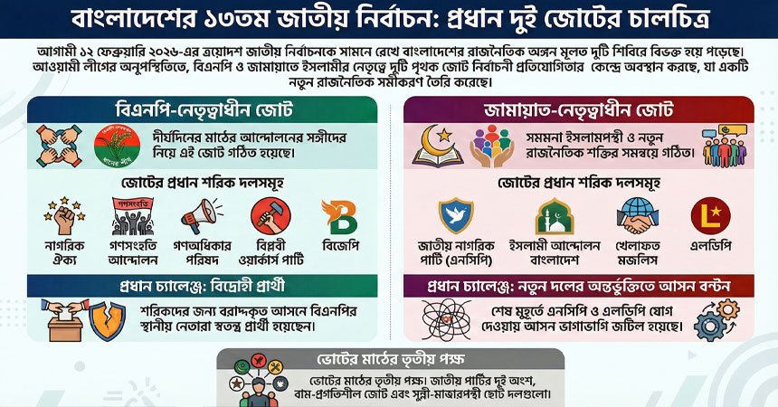 আসন্ন ত্রয়োদশ জাতীয় সংসদ নির্বাচনকে সামনে রেখে দেশের রাজনৈতিক মানচিত্র এখন প্রধানত দুই মেরুতে বিভক্ত। দীর্ঘদিনের মিত্রতা ভেঙে বিএনপি ও জামায়াতে ইসলামী এখন নির্বাচনের ময়দানে একে অপরের প্রধান প্রতিদ্বন্দ্বী। আওয়ামী লীগের অনুপস্থিতিতে এবারের লড়াই হবে মূলত বিএনপি নেতৃত্বাধীন ৯ দলীয় জোট (BNP-led 09 party alliance) এবং জামায়াত নেতৃত্বাধীন ১০ দলীয় জোটের (Jamaat-led 10 party alliance) মধ্যে।