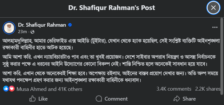আজ (বুধবার, ৪ ফেব্রুয়ারি) সকালে নিজের ভেরিফায়েড ফেসবুক পেজে দেয়া এক স্ট্যাটাস তিনি বলেন, ‘আলহামদুলিল্লাহ আমার ভেরিফাইড এক্স আইডি (টুইটার), যেখান থেকে হ্যাক হয়েছিল, সেই সংশ্লিষ্ট ব্যক্তিটি আইনশৃঙ্খলা রক্ষাকারী বাহিনীর হাতে আটক হয়েছে।’