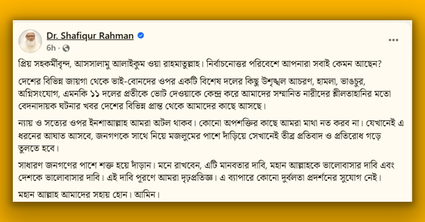 ফেসবুক পোস্টে তিনি লেখেন, দেশের বিভিন্ন জায়গা থেকে ভাই-বোনদের ওপর একটি বিশেষ দলের কিছু উশৃঙ্খল আচরণ, হামলা, ভাঙচুর, অগ্নিসংযোগ; এমনকি ১১ দলের প্রতীকে ভোট দেয়াকে কেন্দ্র করে আমাদের সম্মানিত নারীদের শ্লীলতাহানির মতো বেদনাদায়ক ঘটনার খবর দেশের বিভিন্ন প্রান্ত থেকে আমাদের কাছে আসছে।