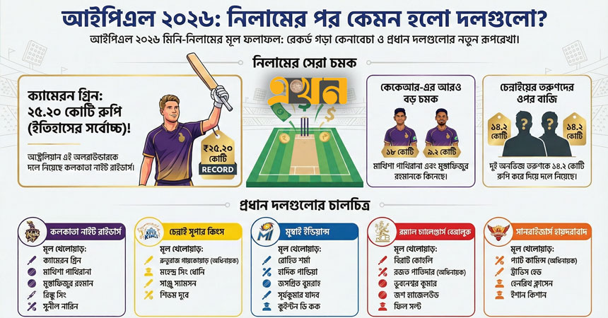 আবুধাবিতে অনুষ্ঠিত ২০২৬ আইপিএল মিনি নিলাম কেবল অর্থের ঝনঝনানি নয়, বরং ফ্র্যাঞ্চাইজিগুলোর সুদূরপ্রসারী পরিকল্পনার এক অনন্য প্রতিফলন। ক্যামেরন গ্রিনের ২৫.২০ কোটির রেকর্ড কিংবা মোস্তাফিজ-পাথিরানাদের নিয়ে কেকেআরের বোলিং শক্তি বৃদ্ধি—সব মিলিয়ে এবারের নিলাম আইপিএল ইতিহাসের অন্যতম রোমাঞ্চকর অধ্যায় হিসেবে চিহ্নিত হয়ে থাকবে।
